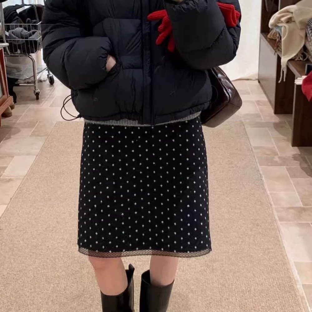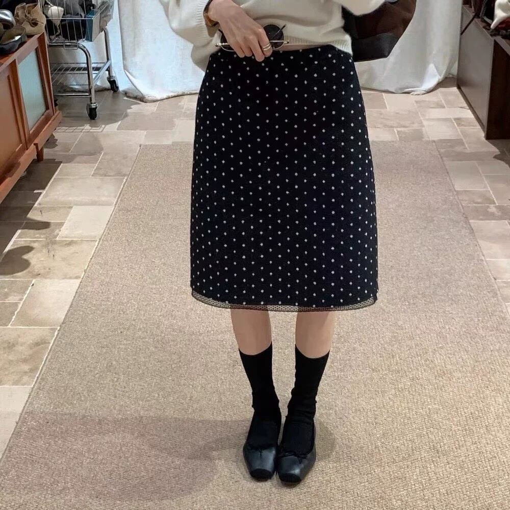 复古波点A字半身裙女高腰蕾丝拼接气质半裙黑色中裙冬季 大码 法式