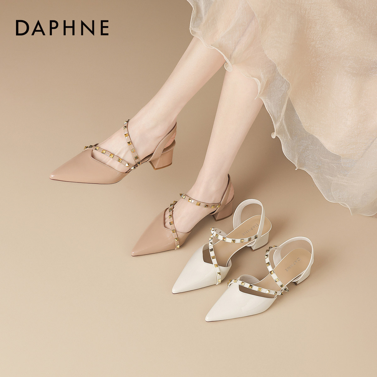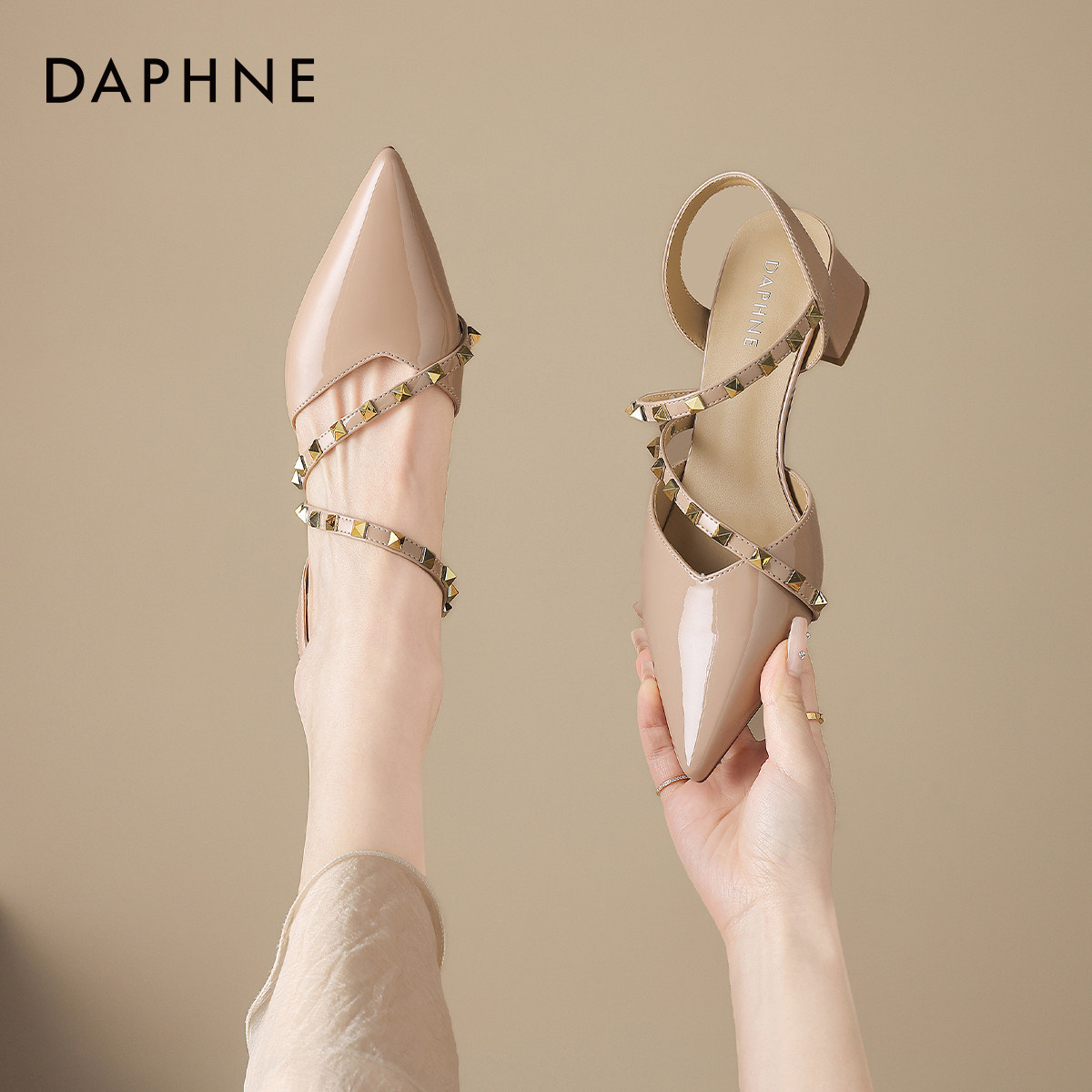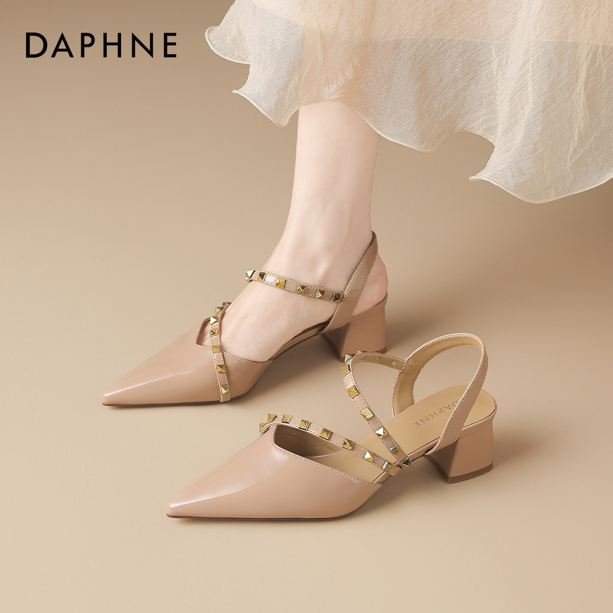 裸色气质单鞋 达芙妮尖头高跟凉鞋 法式 铆钉高跟女鞋 女春季 2026新款