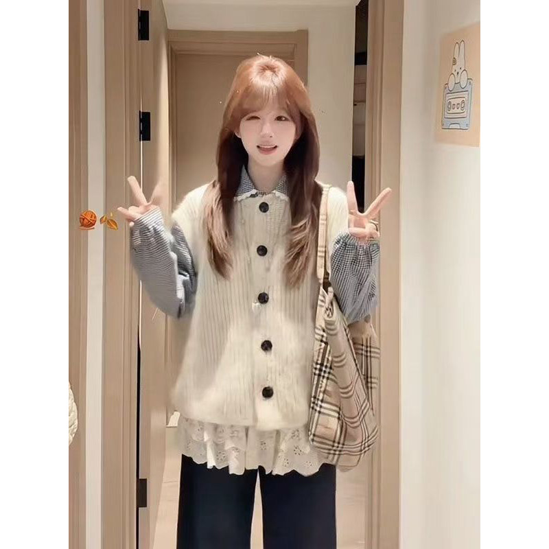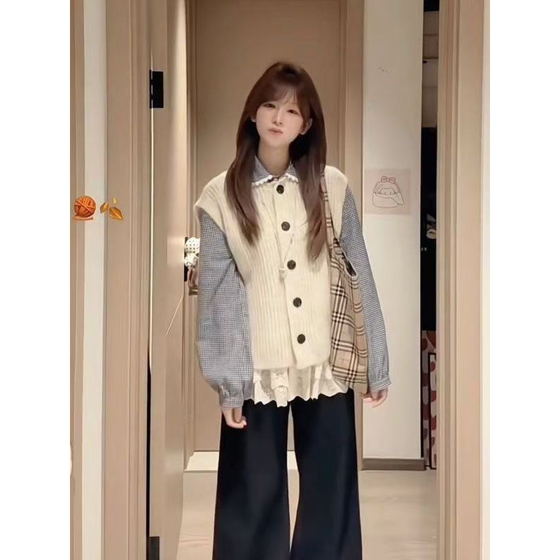 单件秋季 韩系复古杏色针织马甲开衫 女 套装 减龄蕾丝拼接格纹衬衫