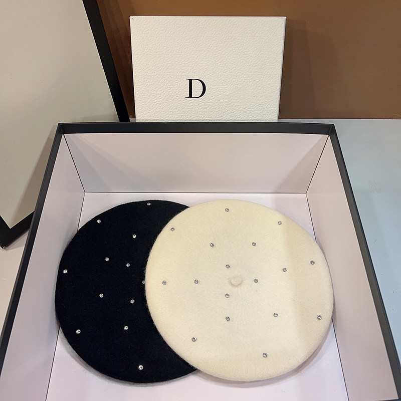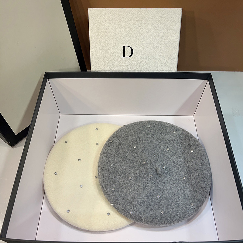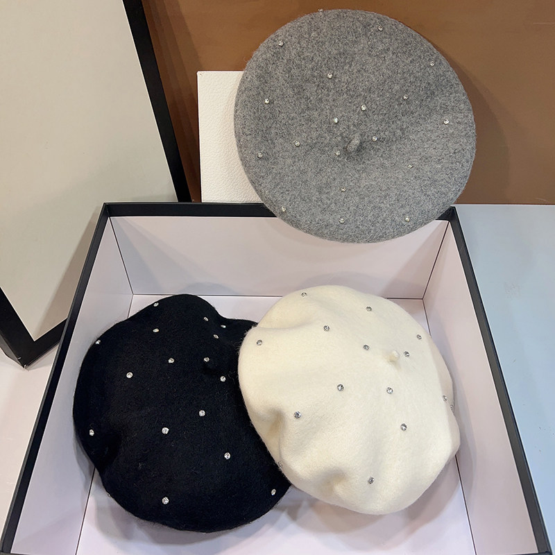 韩版 羊毛呢重工水钻贝雷帽女复古百搭显脸小南瓜帽保暖报童画家帽