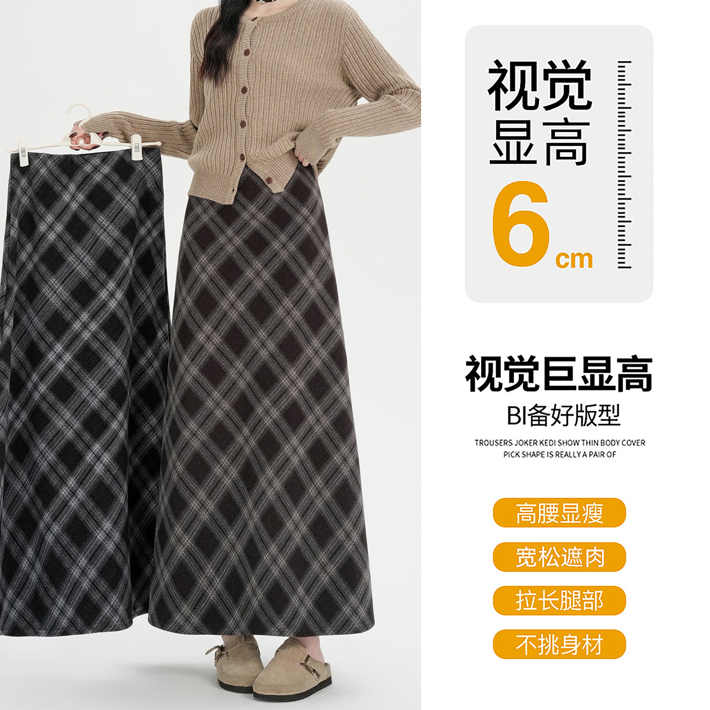 复古格子半身裙女秋冬季 高腰a字大摆长裙黑灰色长款 毛呢格纹裙子