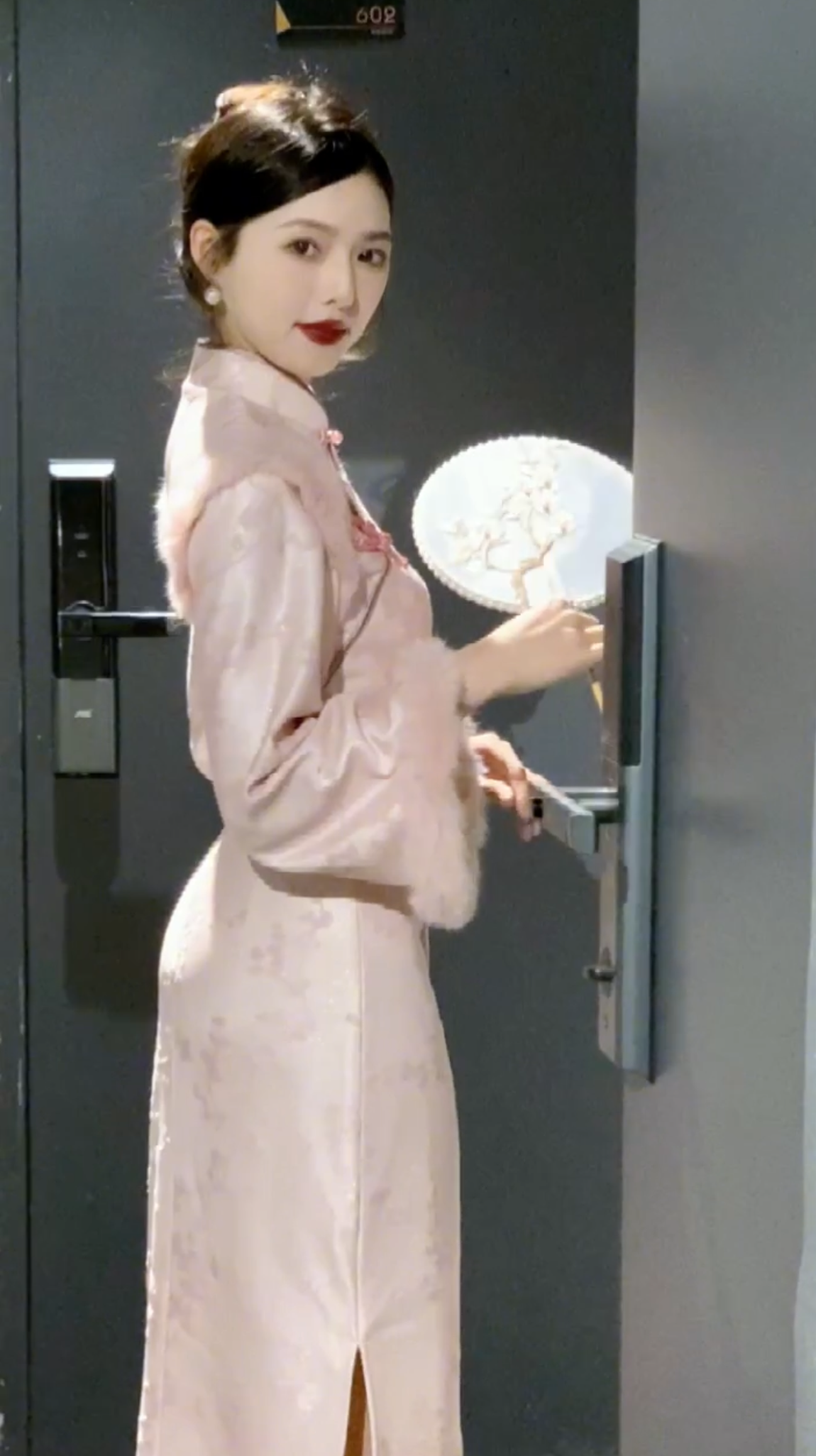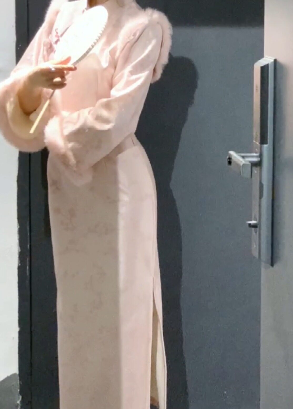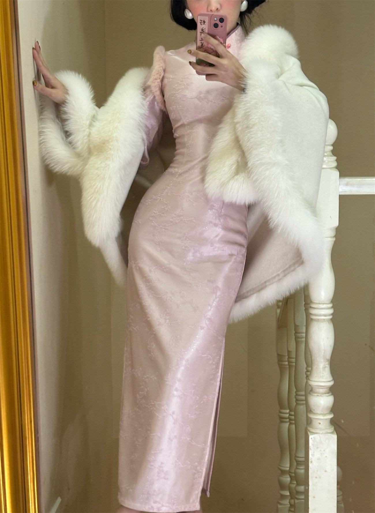 画报夫人原创自制秋冬厚款 提花闪光旗袍温柔兔毛连衣裙 梦境粉