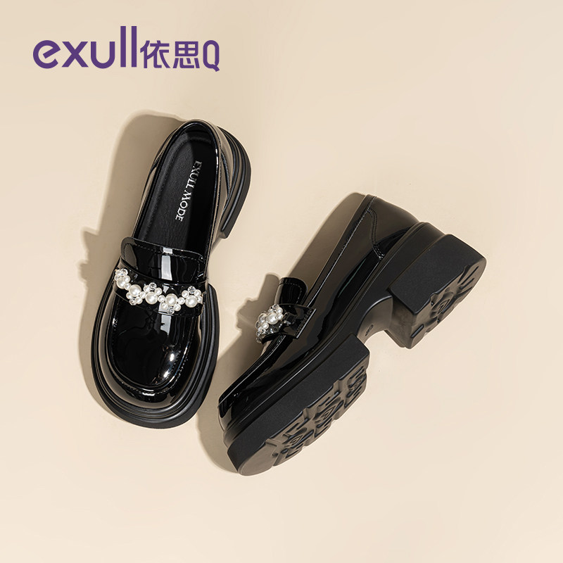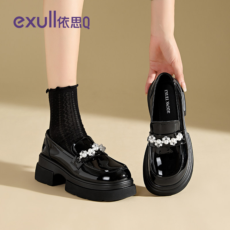 依思q珍珠厚底乐福鞋 黑色学院一脚蹬玛丽珍小皮鞋 女2025新款 冬季