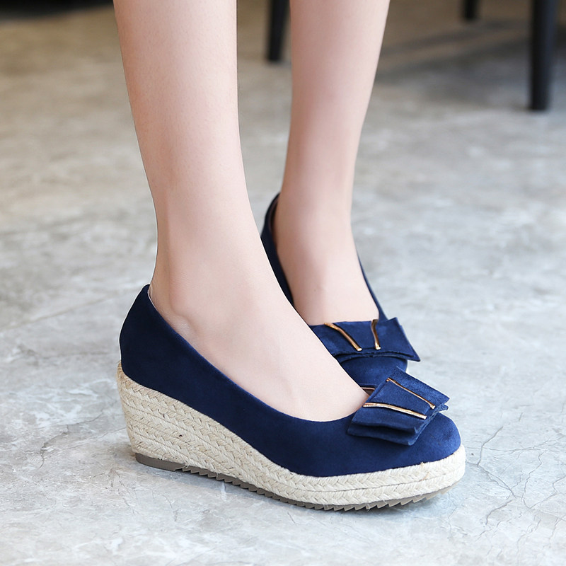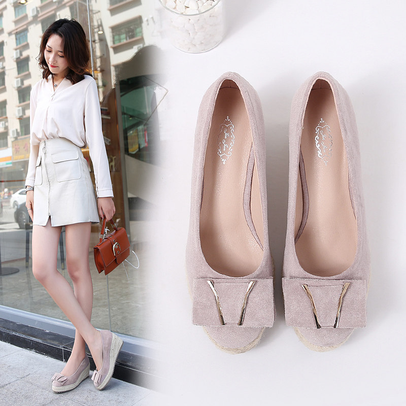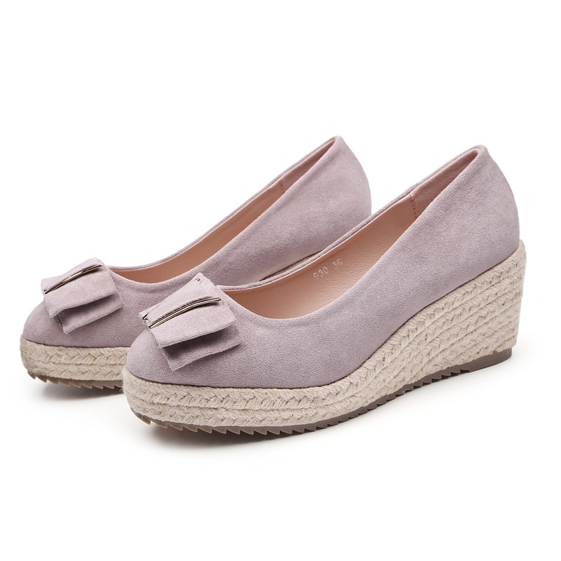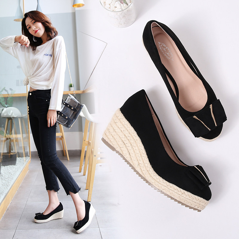 2020春秋季 子 女浅口圆头厚底防水台草编高跟女鞋 新款 真皮坡跟单鞋