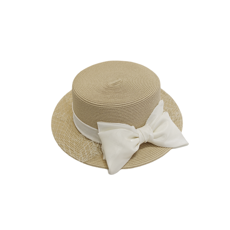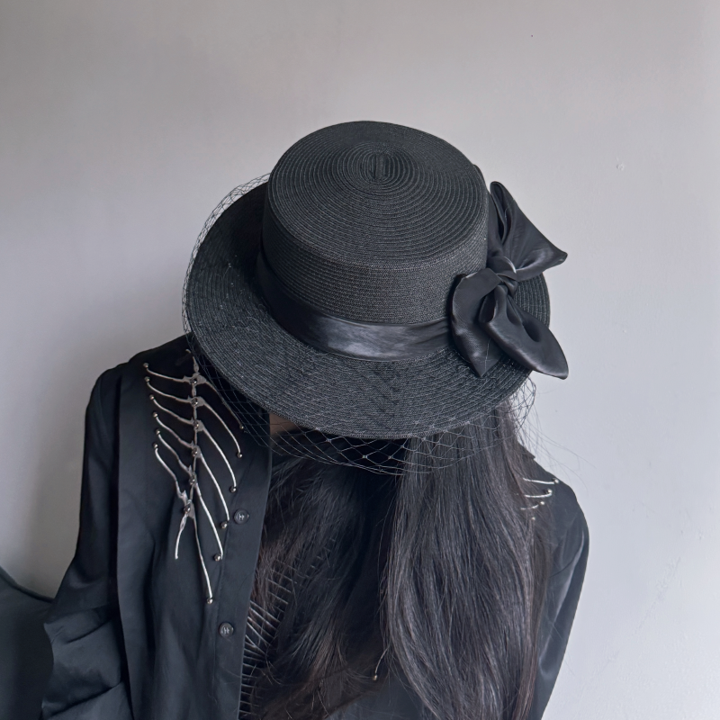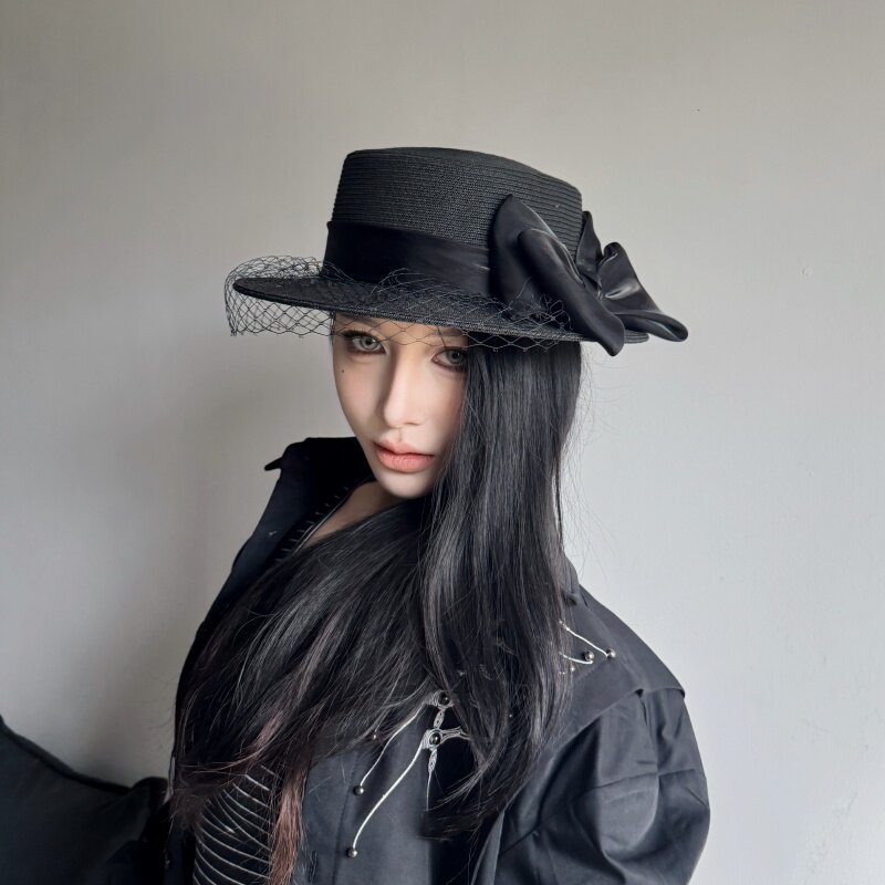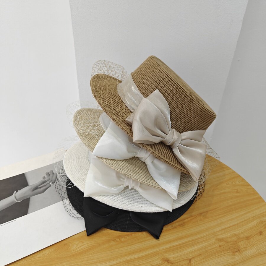 法式 复古蝴蝶结网纱平顶草帽子女夏季 海边度假风防晒遮阳小檐礼帽
