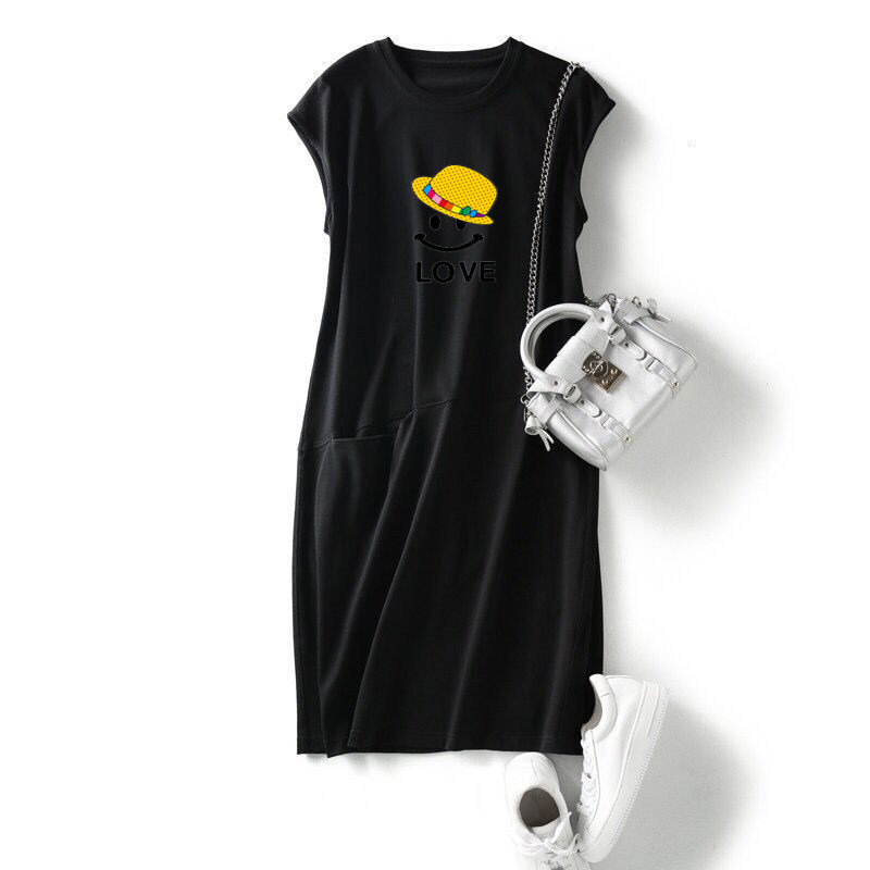 新款 短袖 女装 夏季 流行宽松显瘦笑脸无袖 T恤连衣裙中长口袋仙女裙