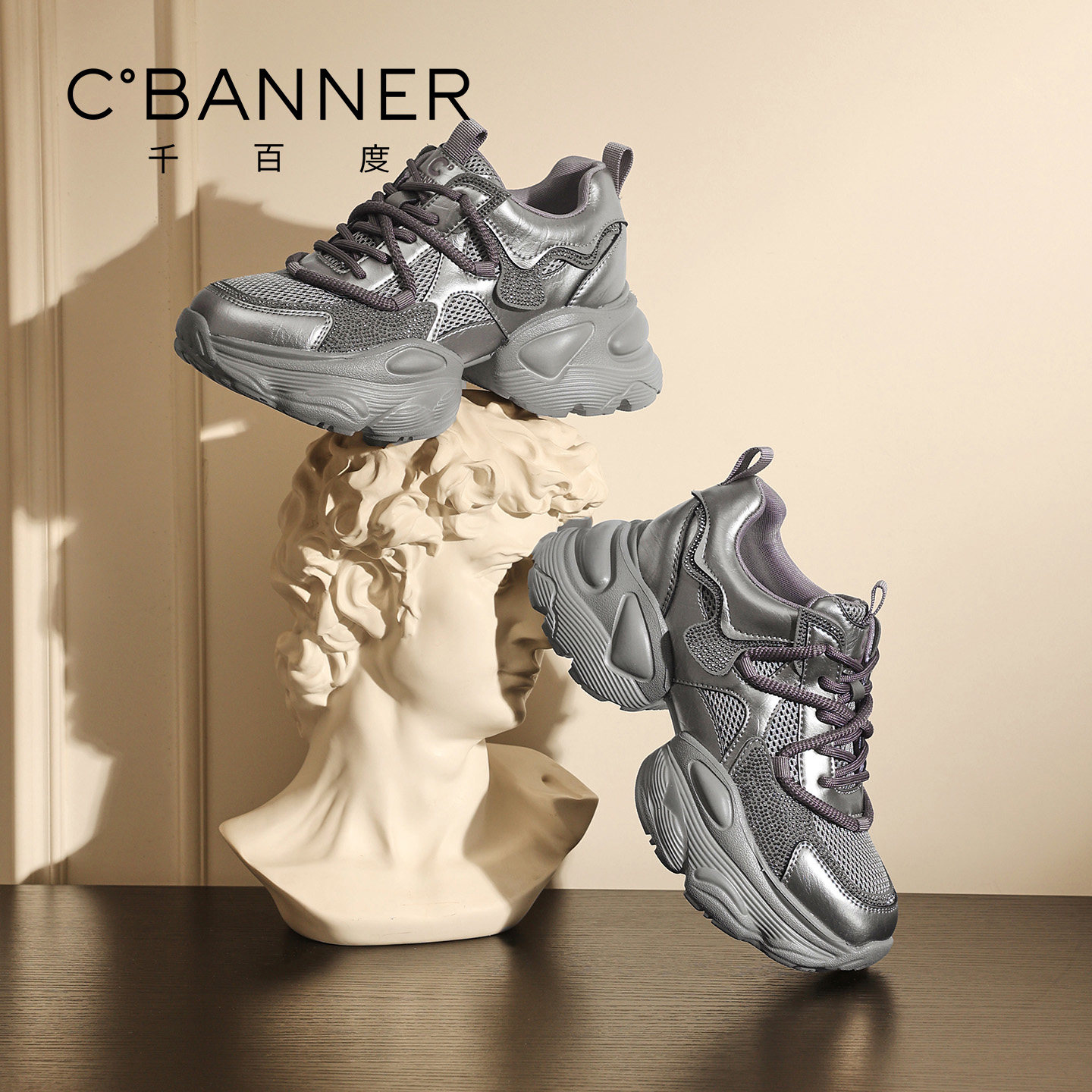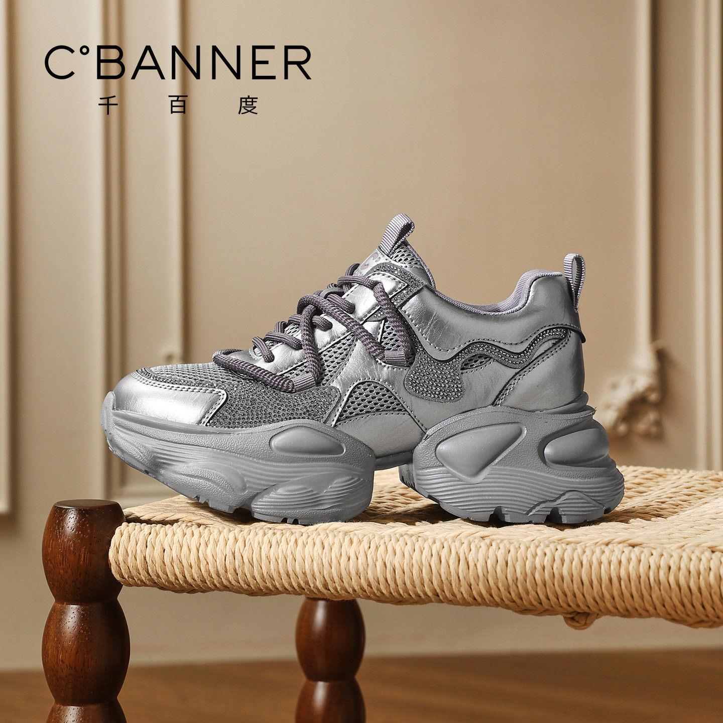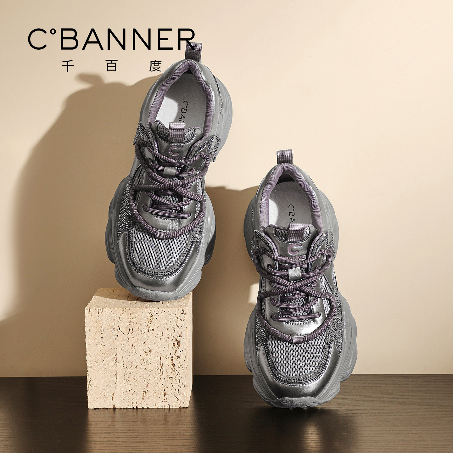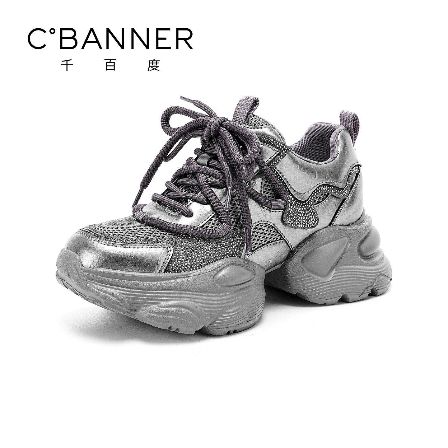 千百度厚底老爹鞋 透气网面女鞋 女新款 百搭厚底增高系带休闲运动鞋