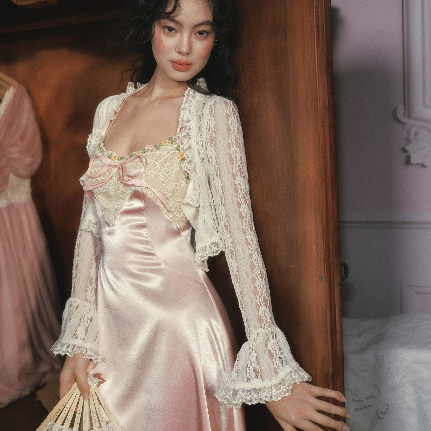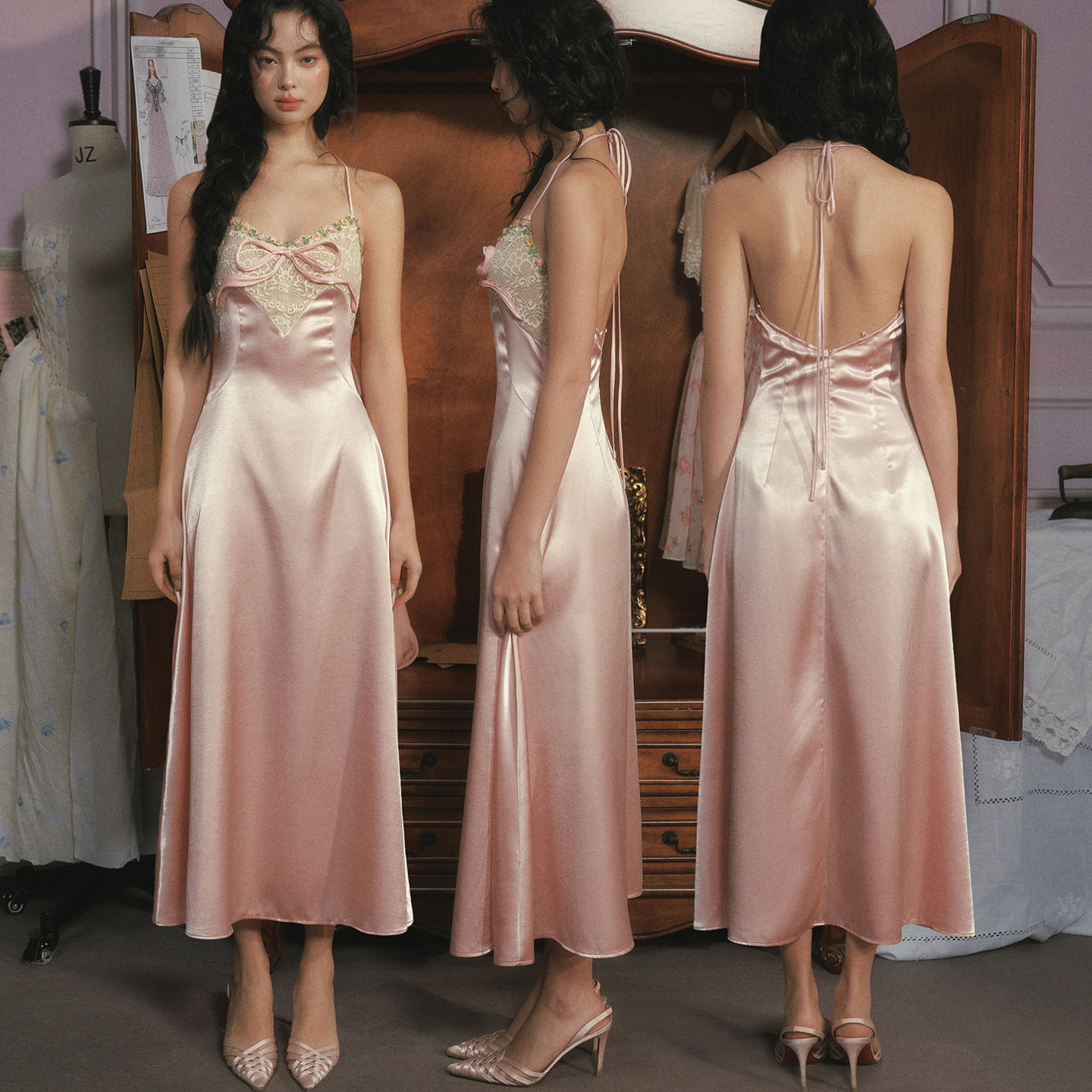 法式 LaceMade 粉蝶心愿 复古优雅缎面露背长裙高腰显瘦A摆连衣裙