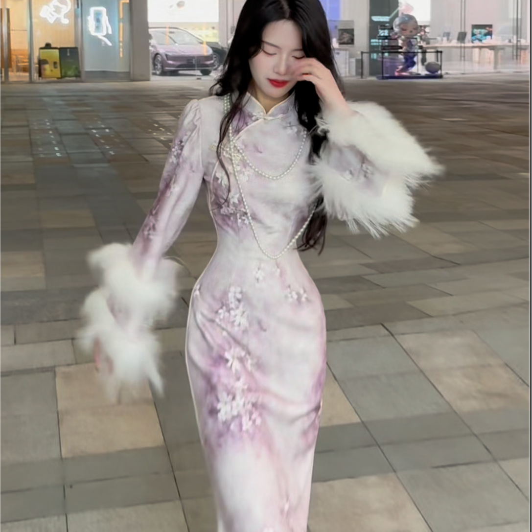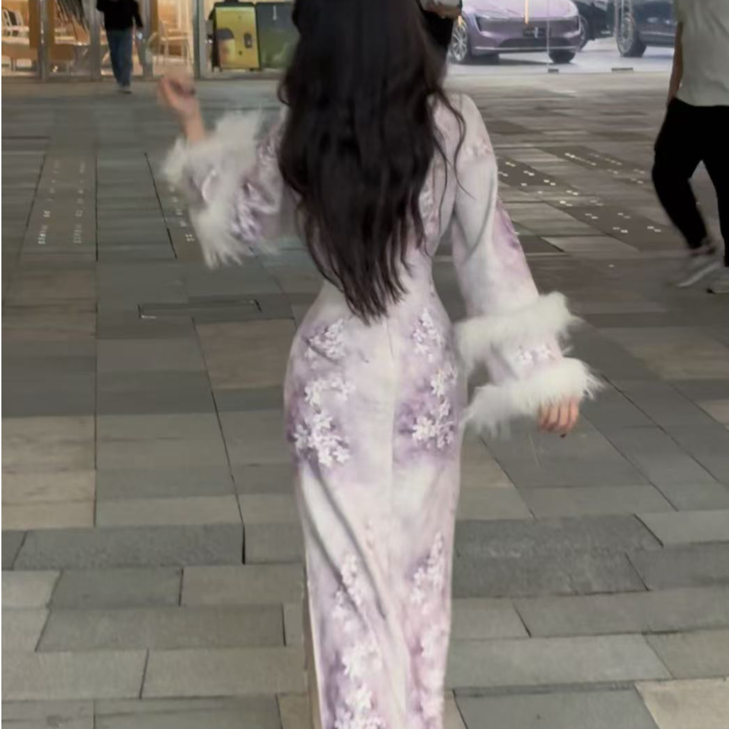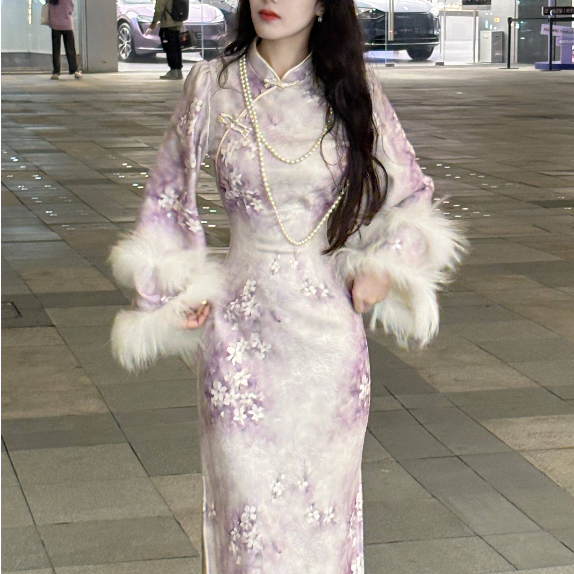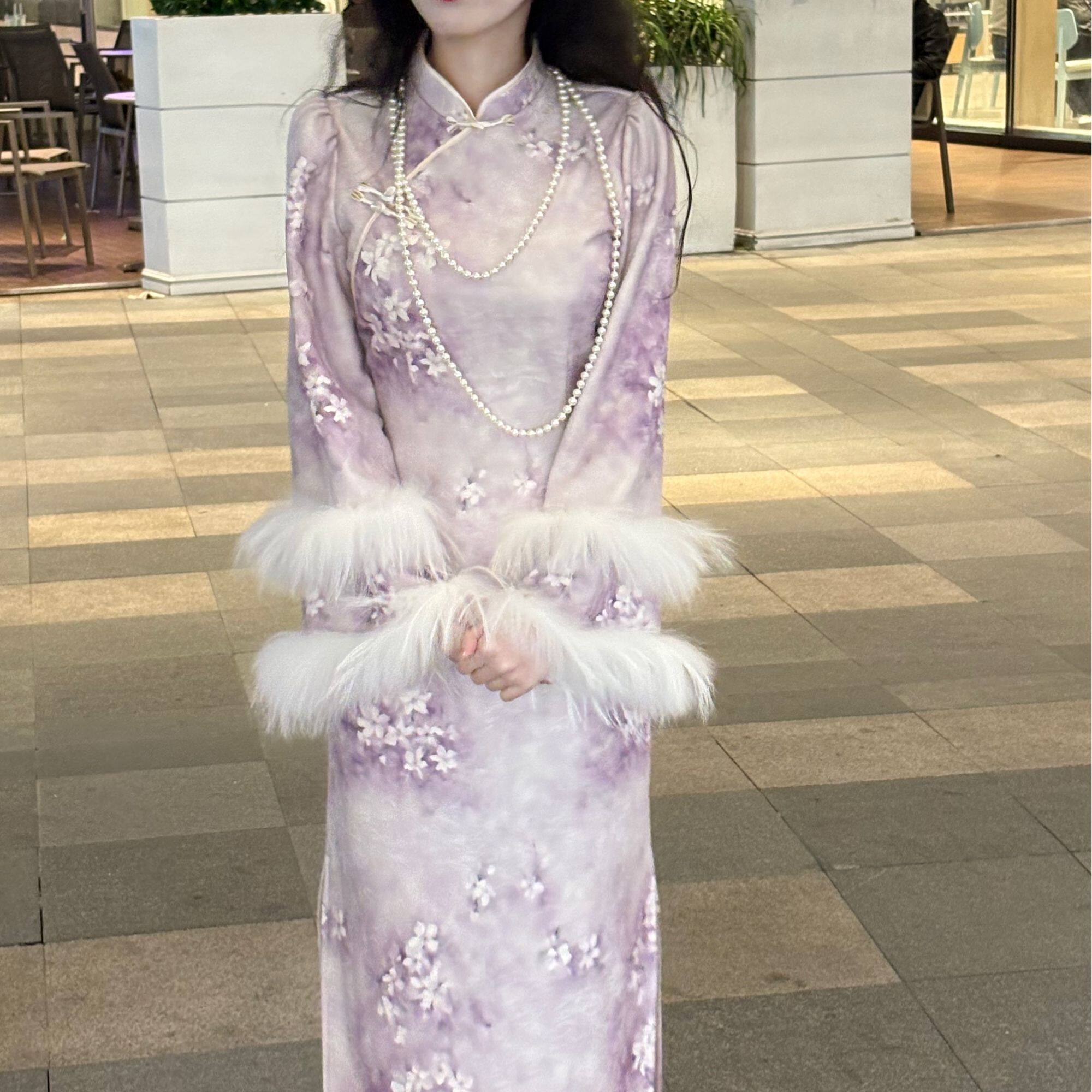 LHMknk1画报夫人原创自制针织提花温柔紫色加绒旗袍连衣裙绒花紫