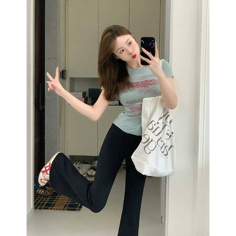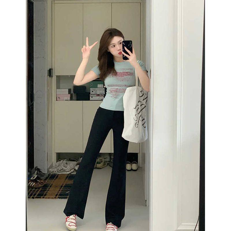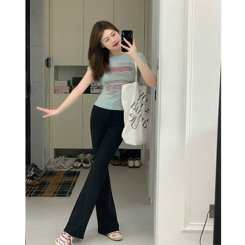 复古黑色高腰弹力显瘦微喇裤 女春夏薄款 小个子窄版 美式 直筒长裤 子