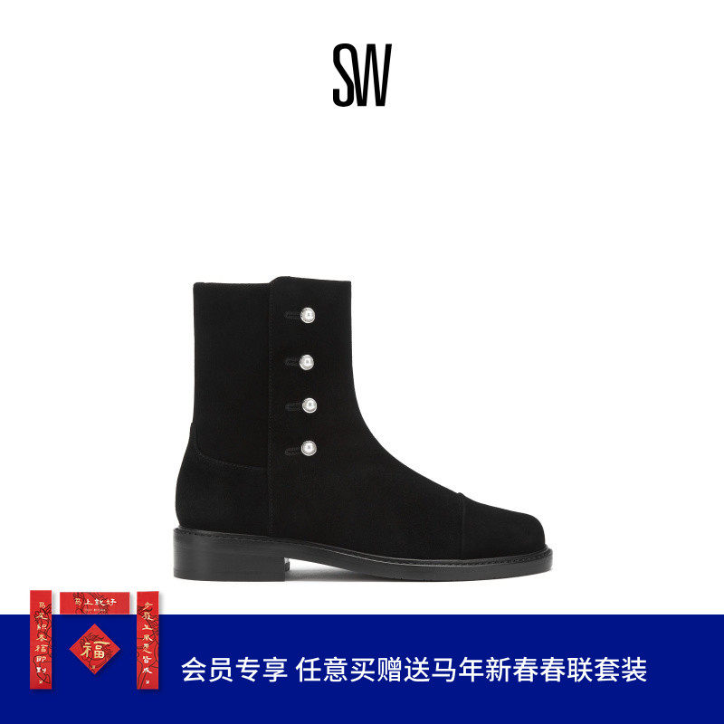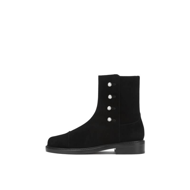 BEHALF 拼接低跟圆头珍珠装 饰扣式 拉链冬季 短靴女
