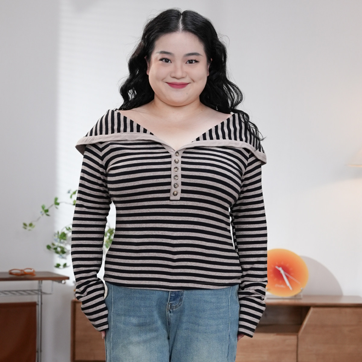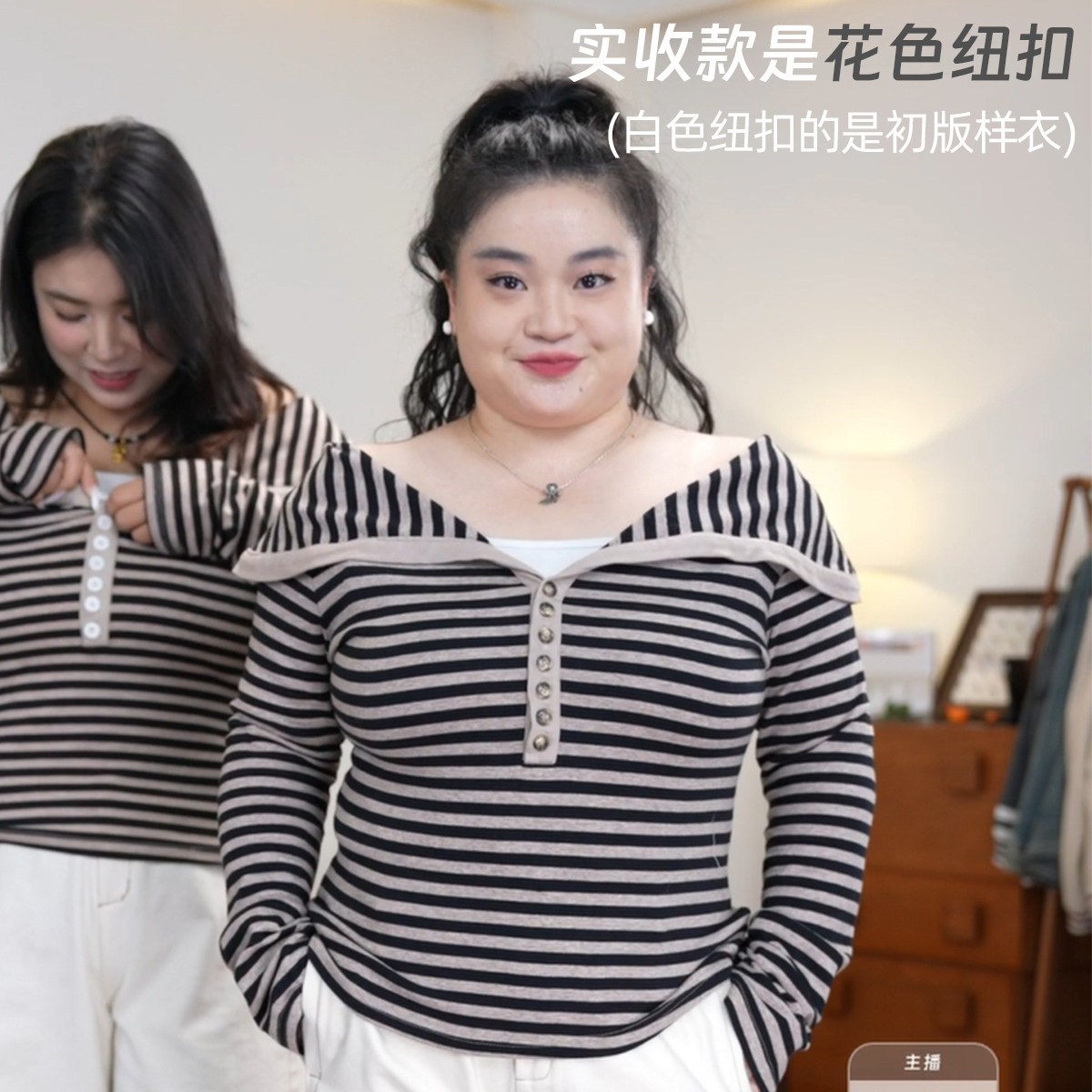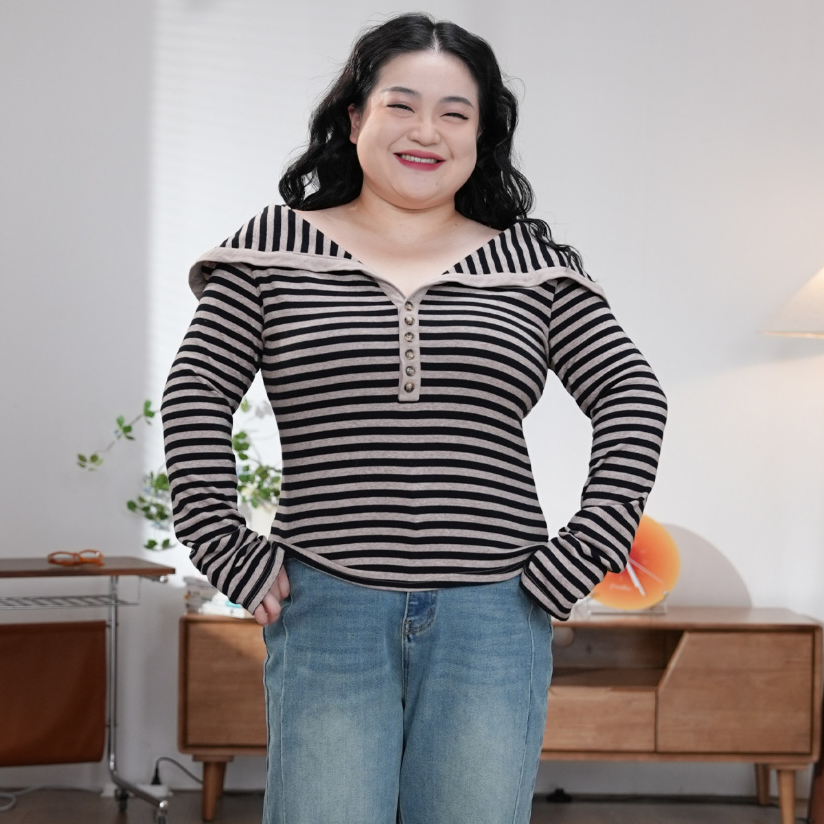 月光手书 大码 胖mm 福饮沸别 休闲条纹翻领一字肩上衣2572