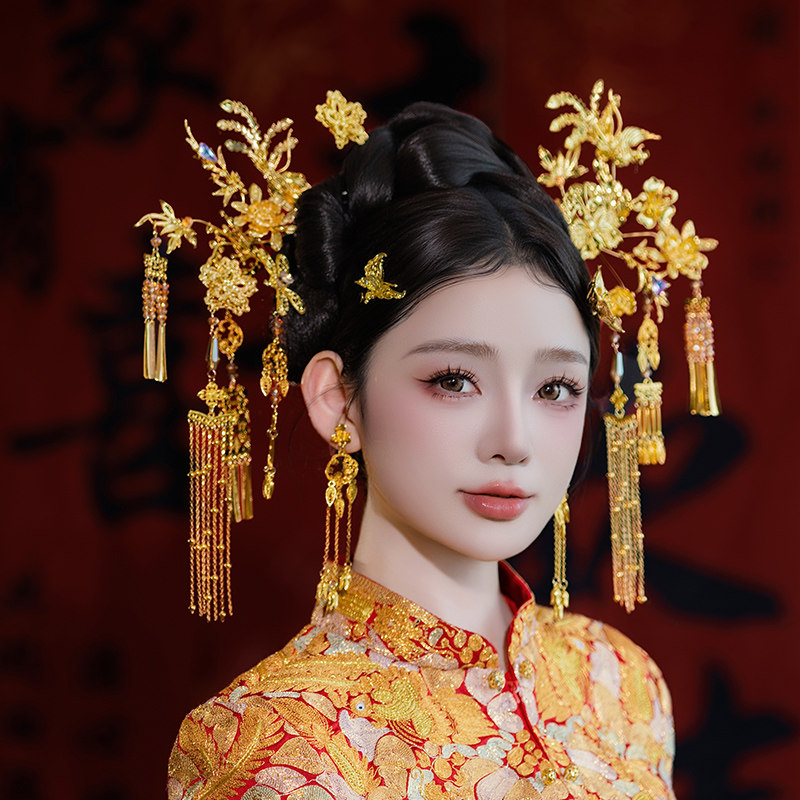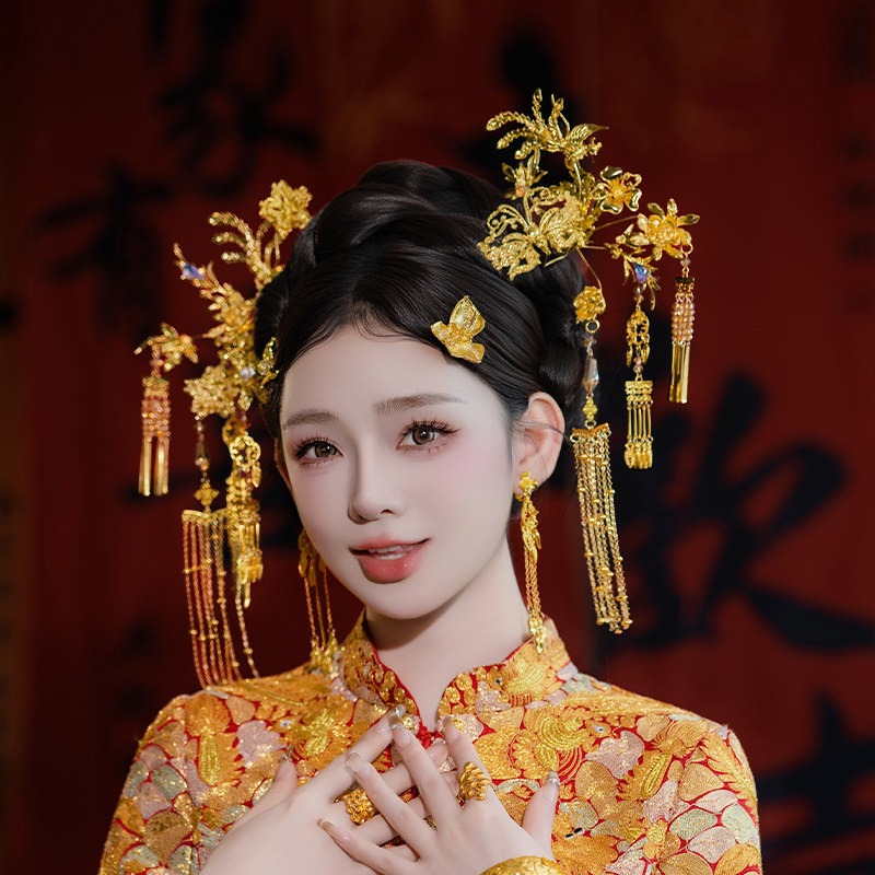 中式 秀禾头饰金色喜字流苏新娘结婚高级大气龙凤褂汉服婚礼发饰品