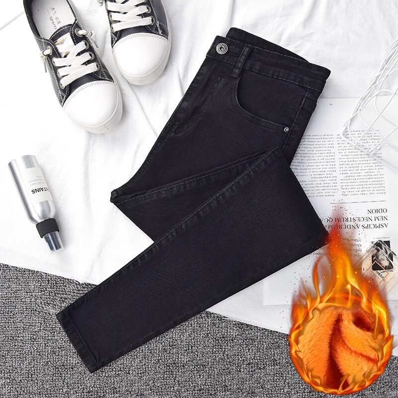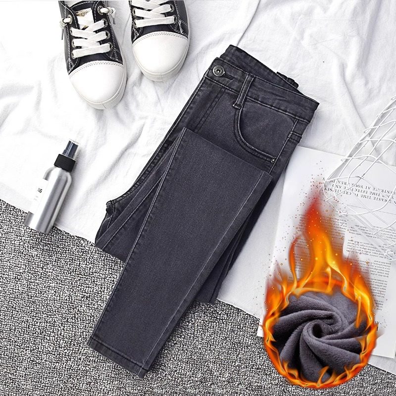 女高腰冬季 新款 带绒加厚保暖棉裤 2024加绒牛仔裤 紧身显瘦小脚长裤