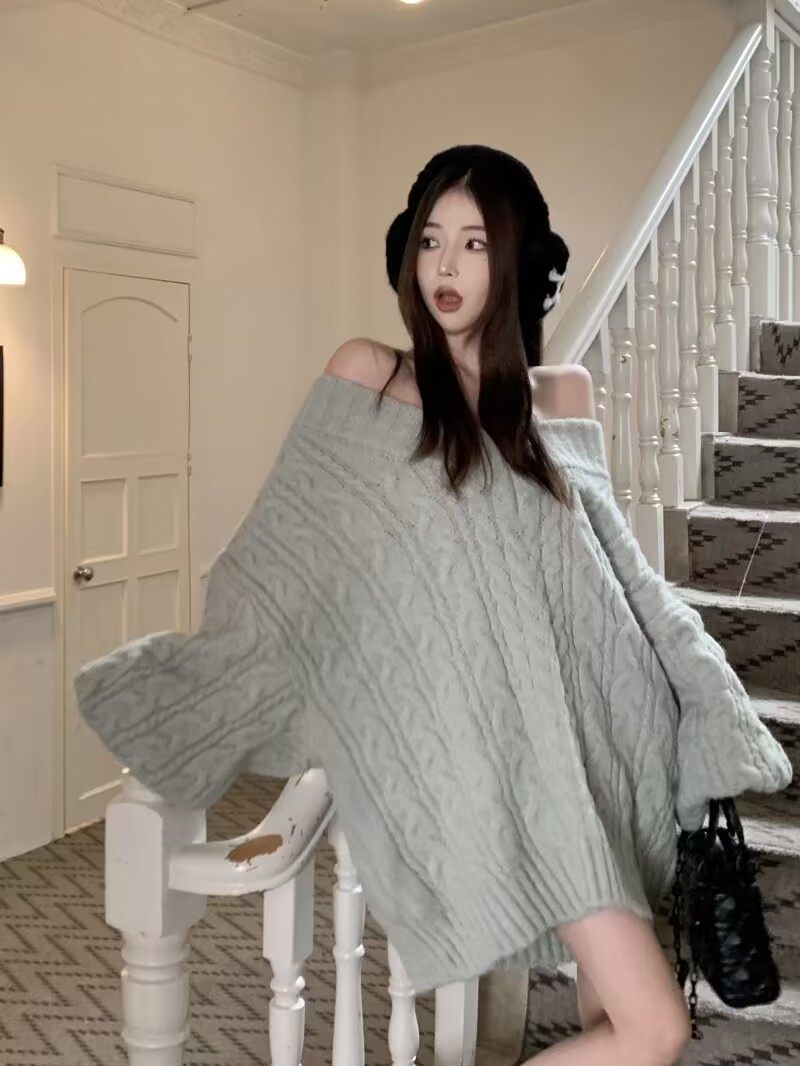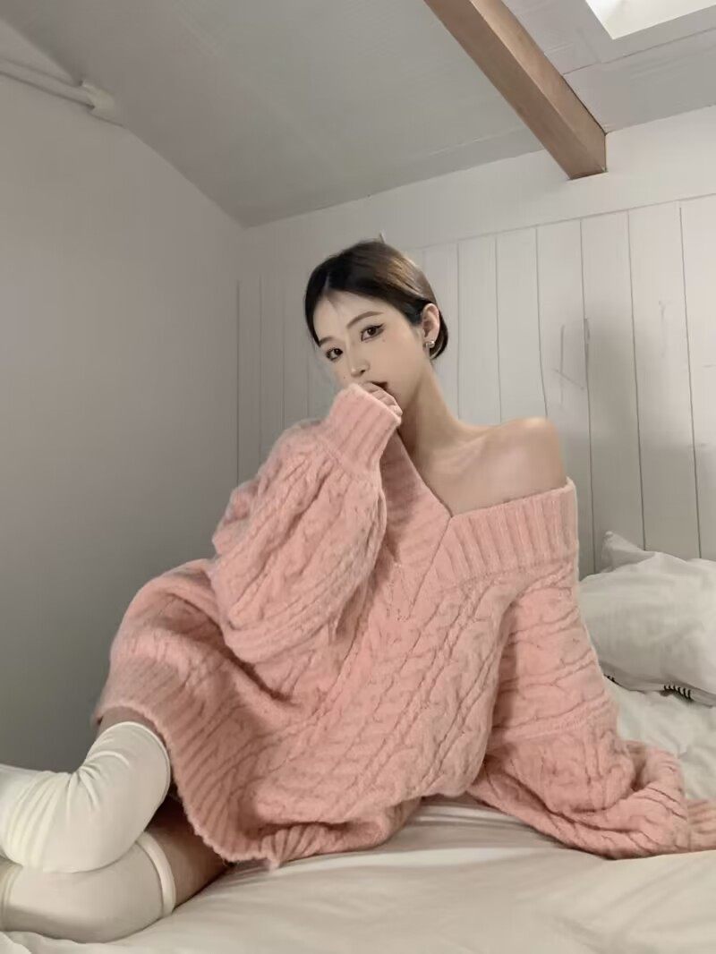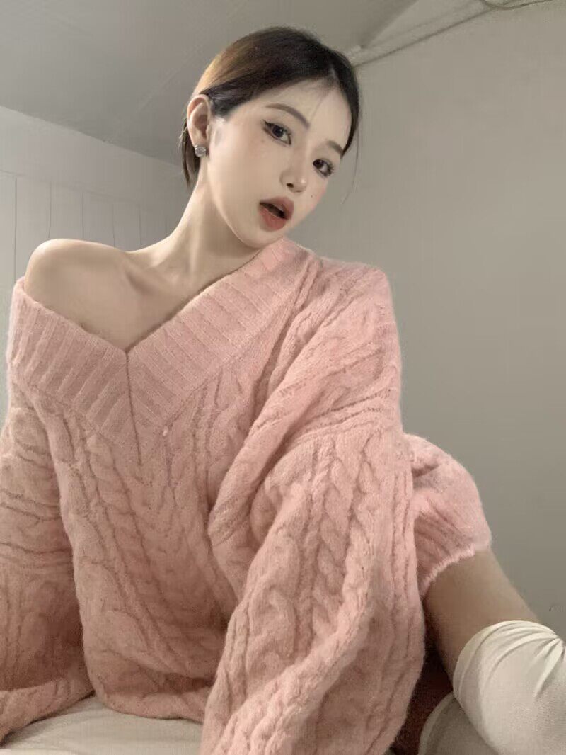 韩系甜美减龄软糯V领麻花宽松套头毛衣女学生秋冬百搭针织衫 上衣