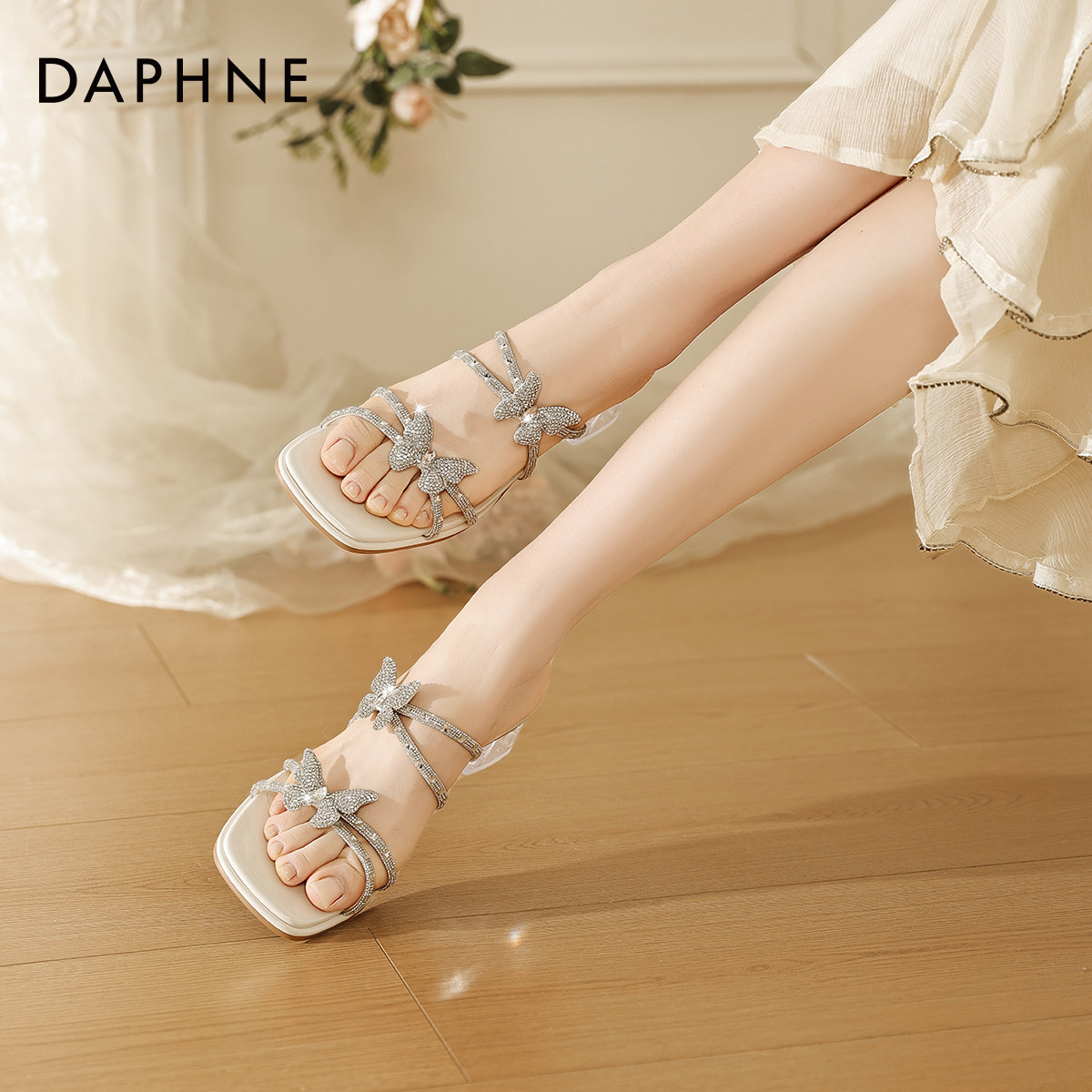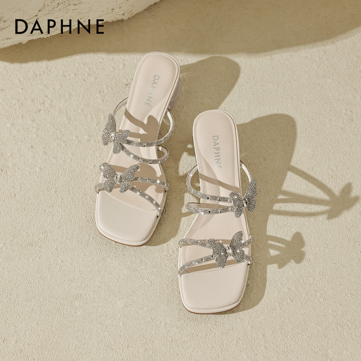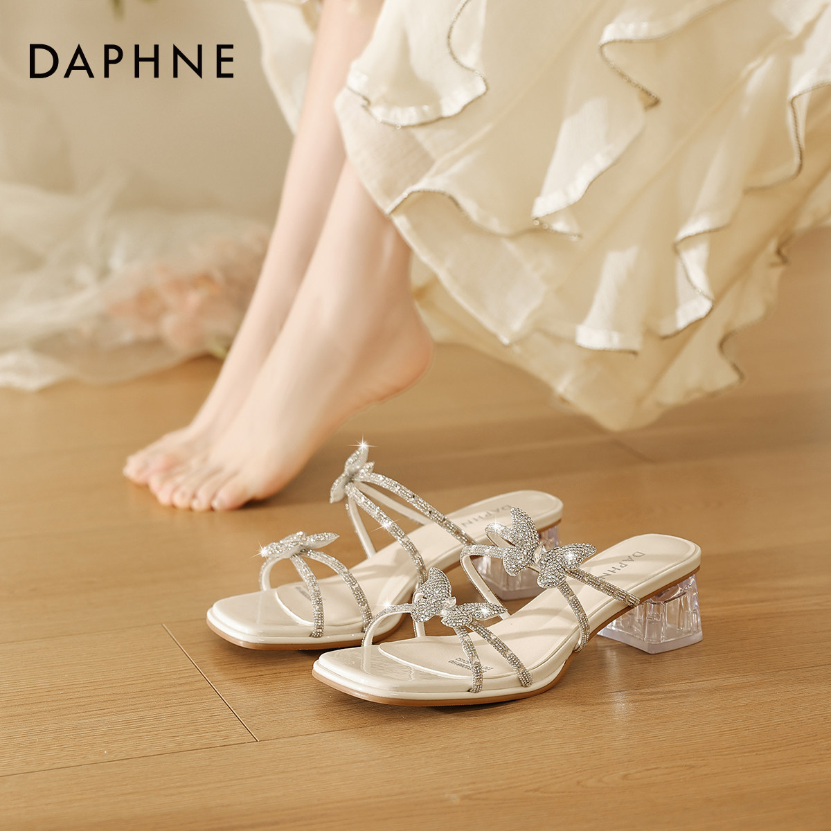 女2026新款 春夏季 一字外穿凉鞋 达芙妮凉拖鞋 水钻粗跟高跟鞋 方头