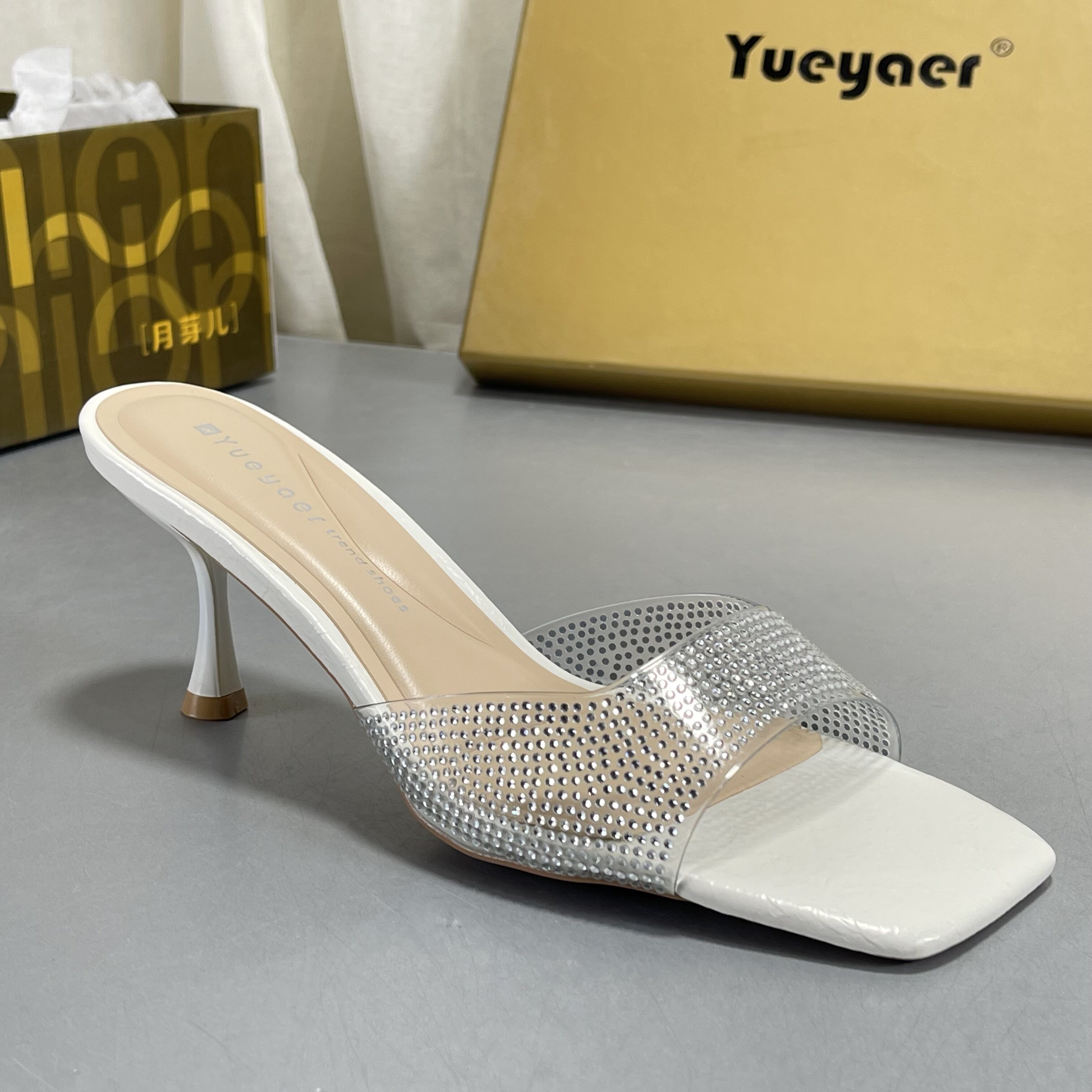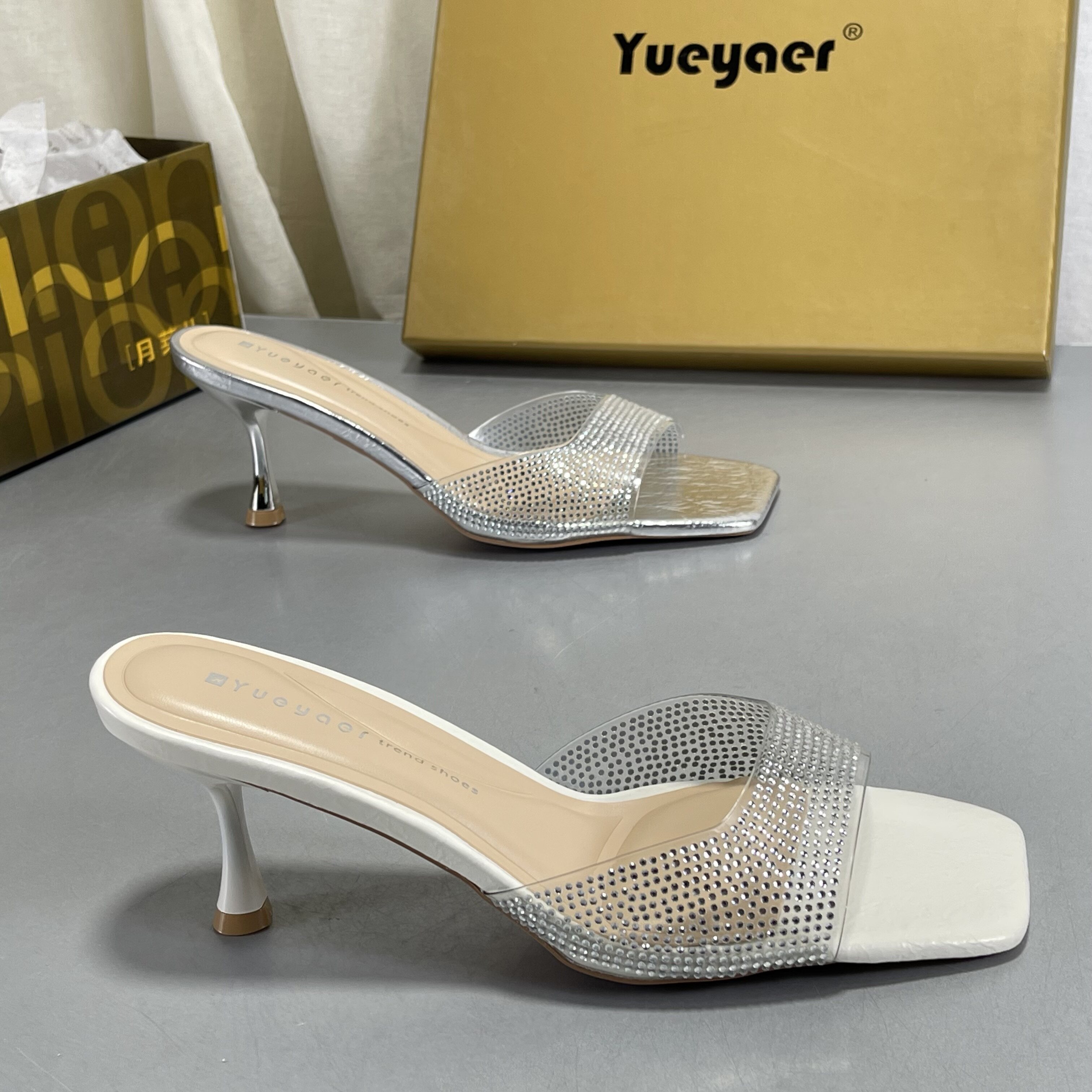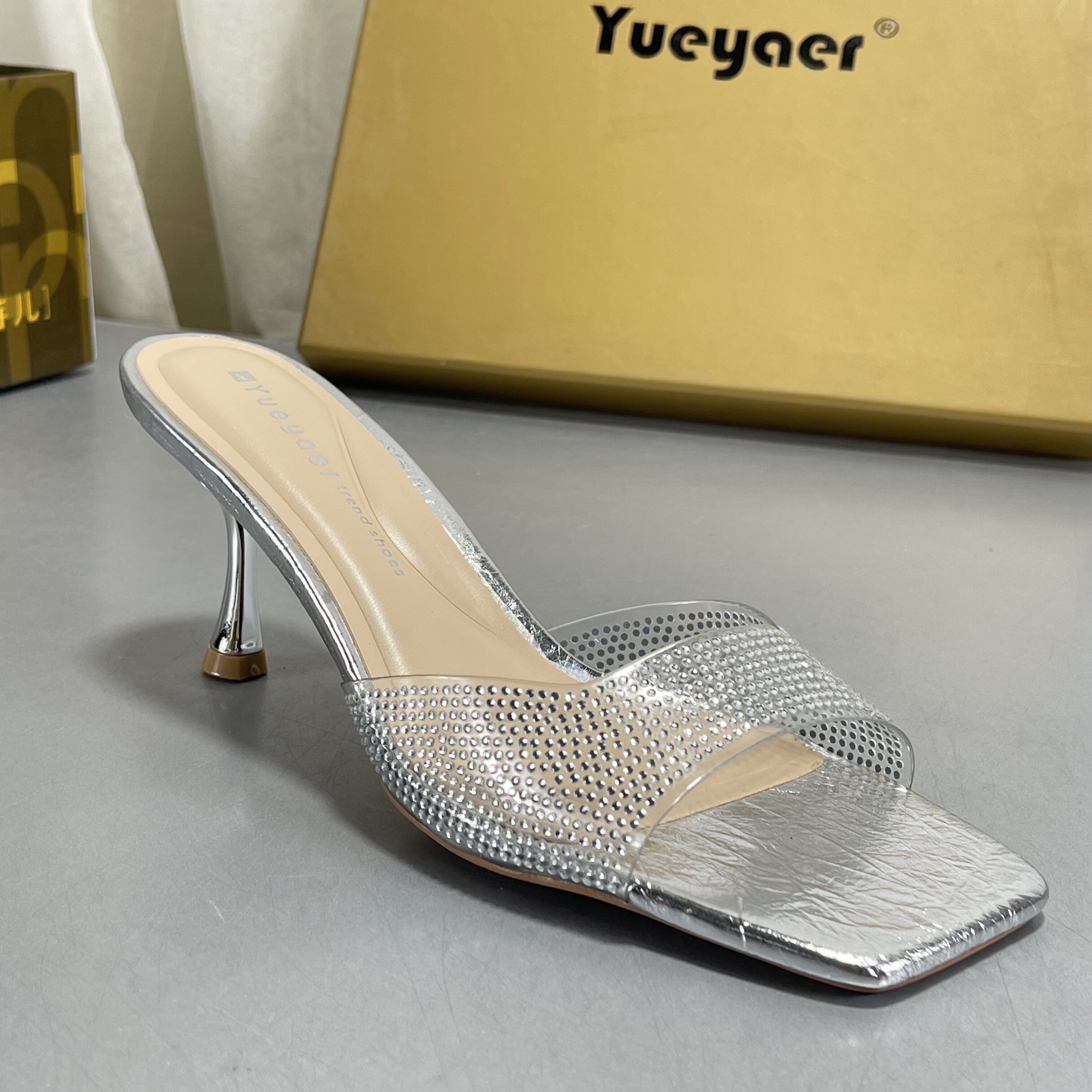 凉鞋 月芽儿2026新款 露趾方头水钻银色漆皮一字拖女性感细跟高跟鞋