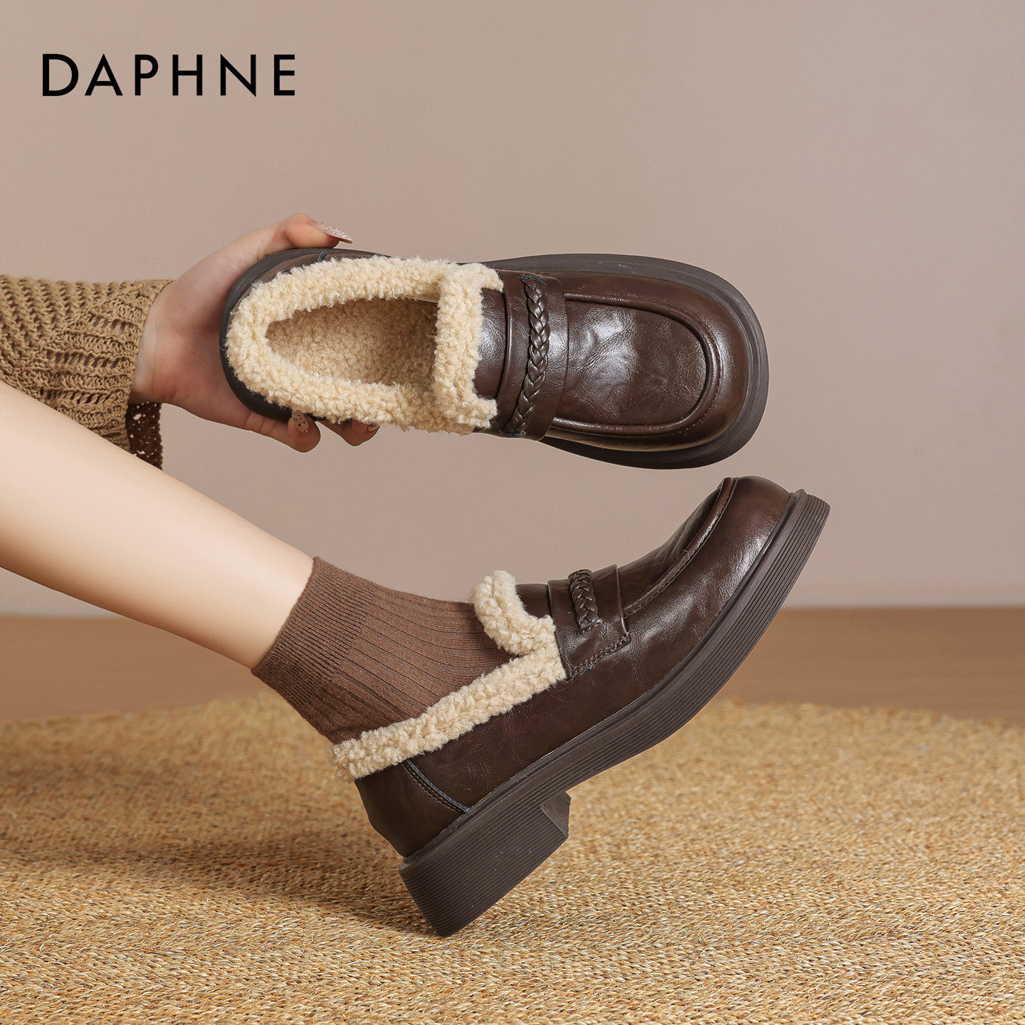 女厚底2026新款 春季 女鞋 达芙妮棕色乐福鞋 羊羔绒加厚英伦风小皮鞋