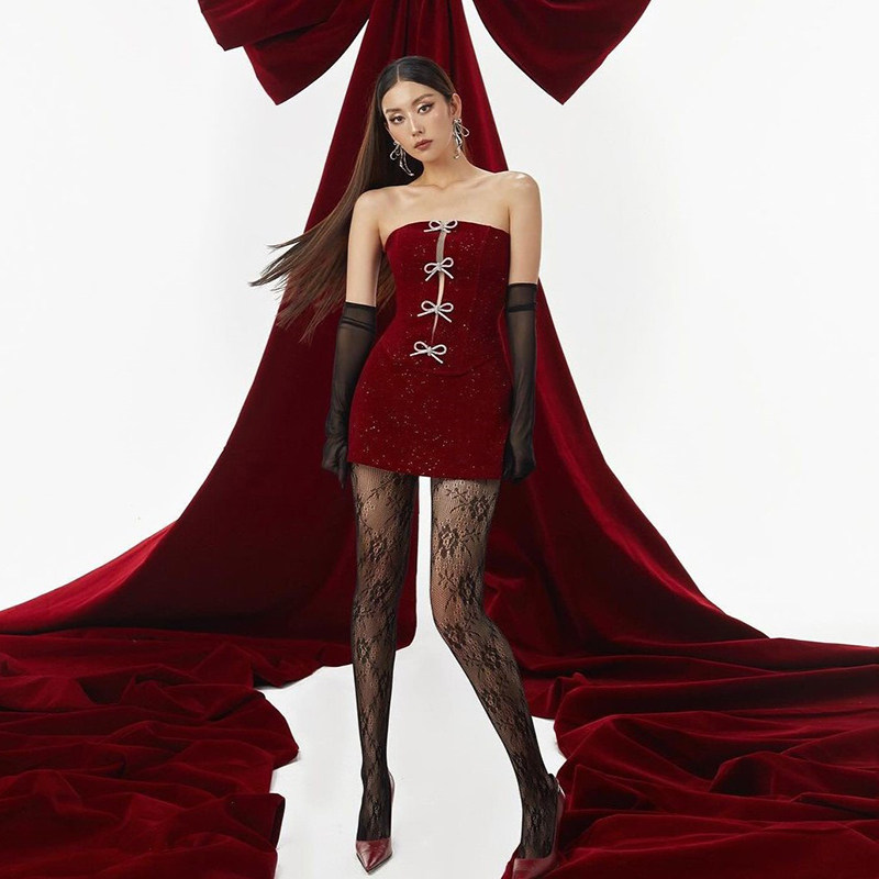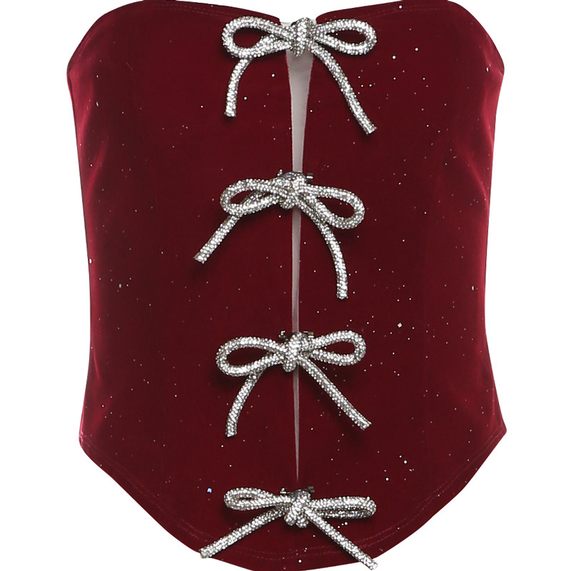 KLIOU 年会穿搭亮闪闪镂空蝴蝶结抹胸背心显瘦高腰A字短裙套装 女