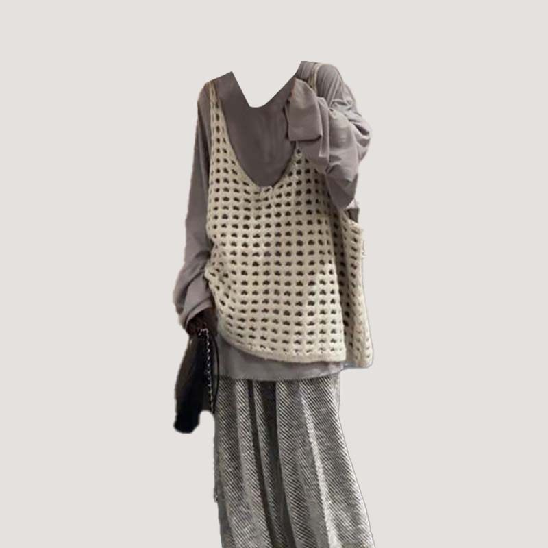 大码 三件套女 t恤镂空针织马甲阔腿裤 胖mm慵懒风休闲套装 上衣长袖