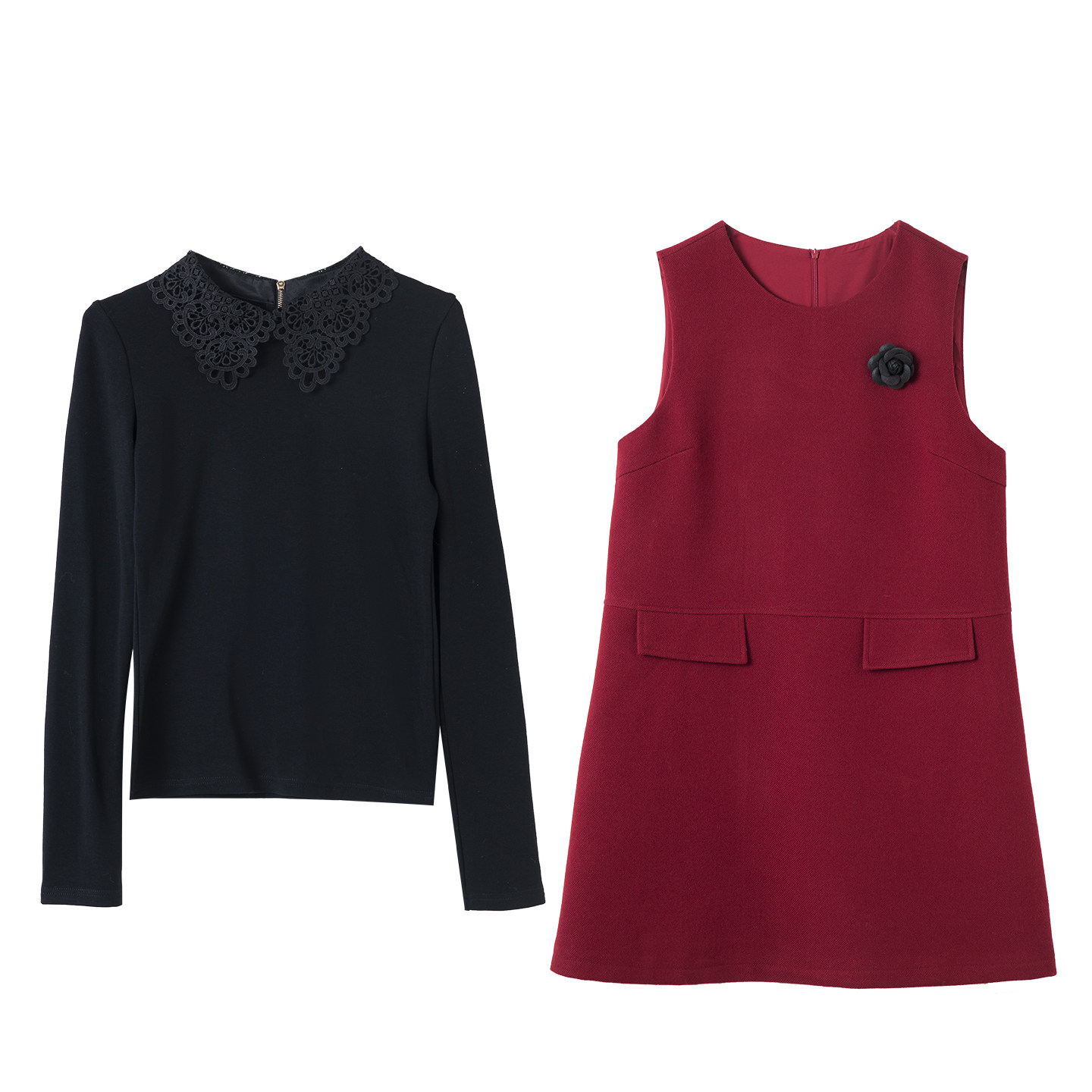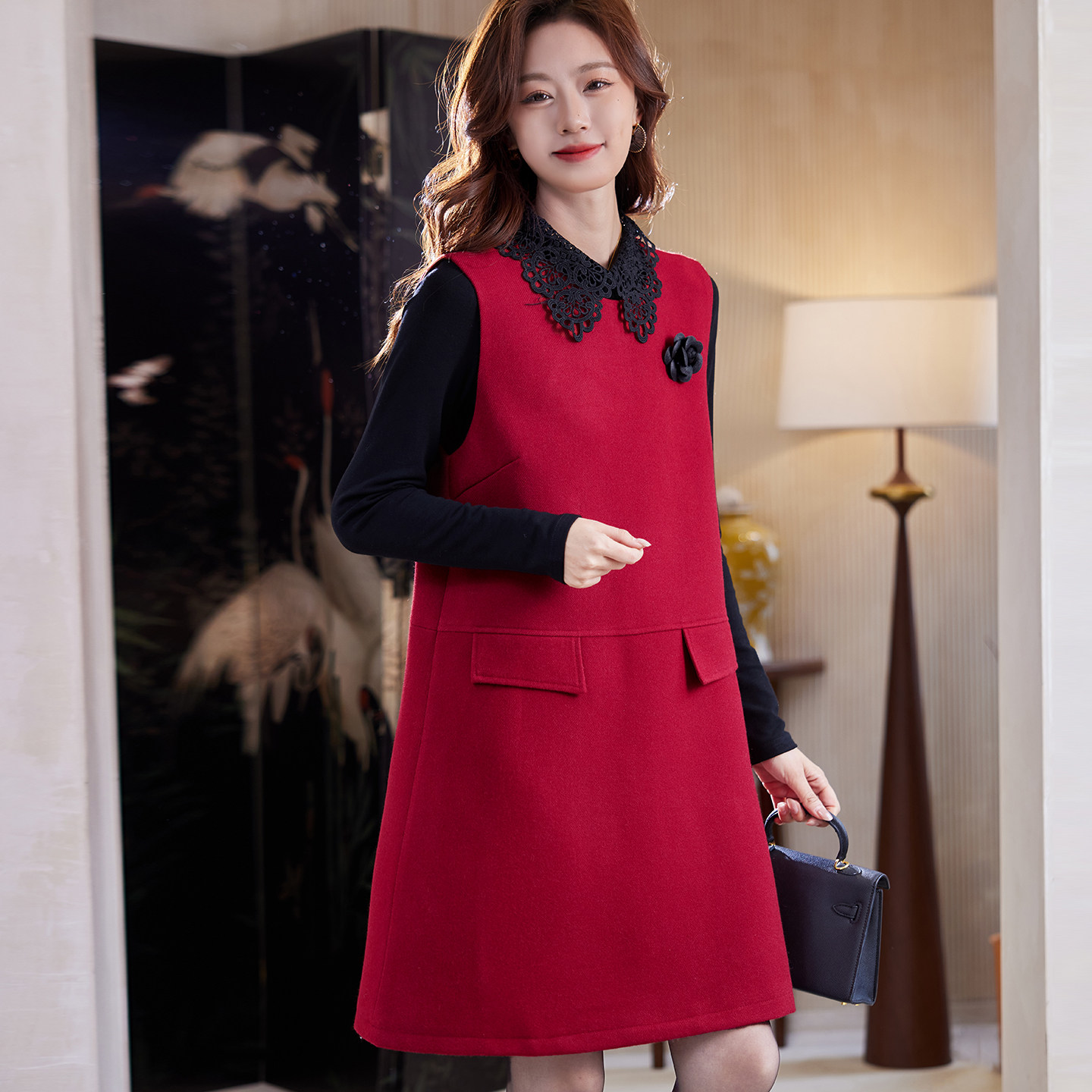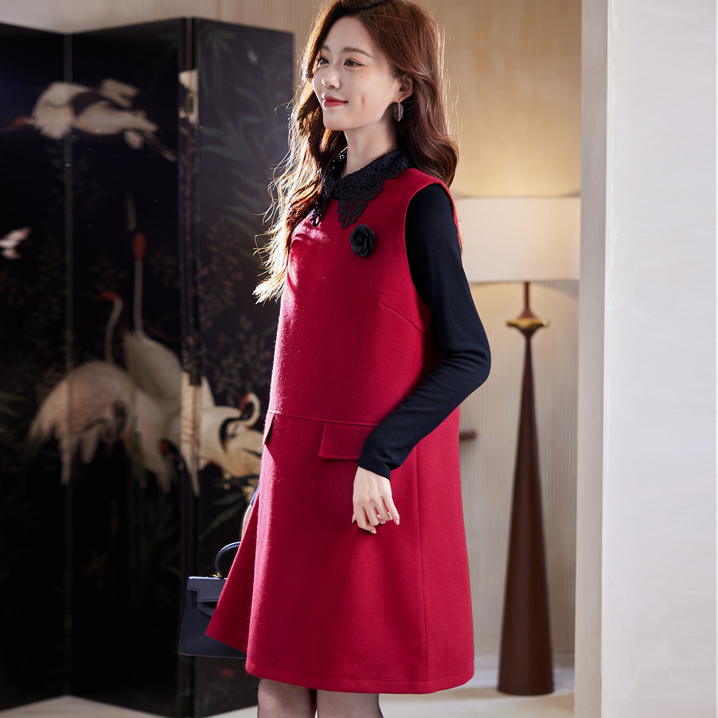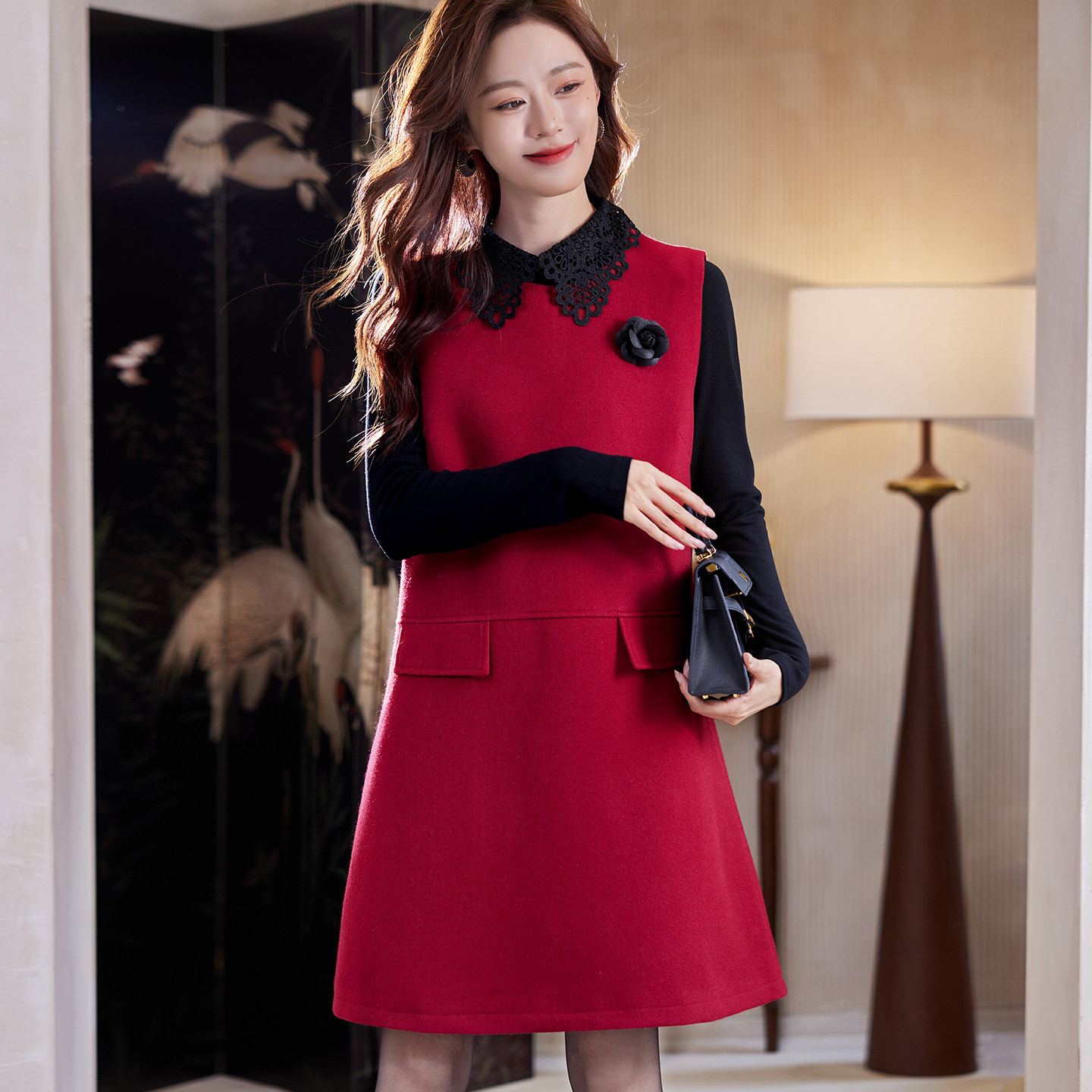 宝诗黎两件套蕾丝拼接红色连衣裙2026早春气质老钱风休闲背心裙