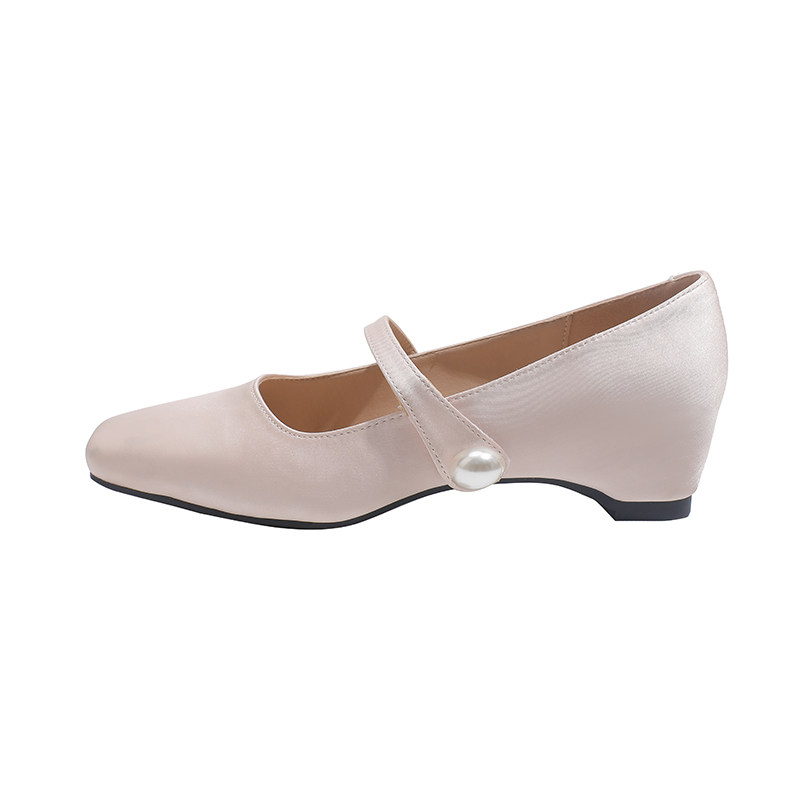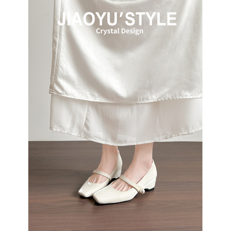 女通勤珍珠扣一字带晚晚风玛丽珍单鞋 真皮 骄屿裸色方头粗高跟鞋