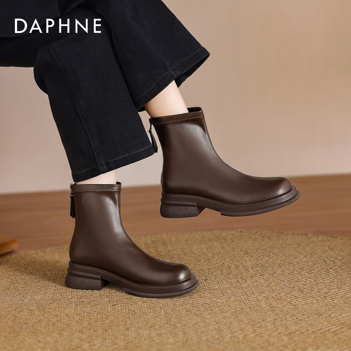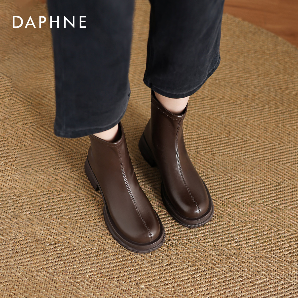 冬季 达芙妮棕色短靴女2026新款 秋冬加绒瘦瘦靴厚底马丁靴妈妈鞋