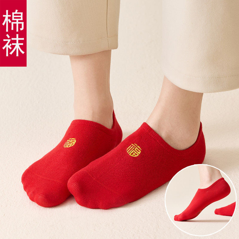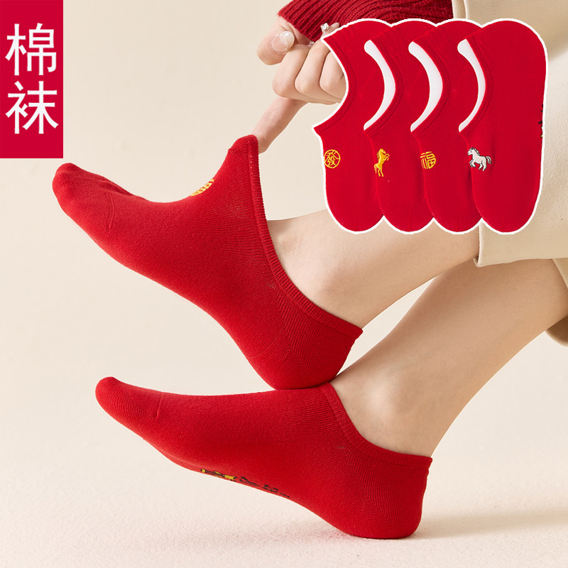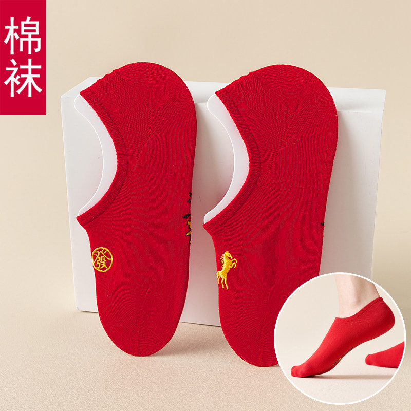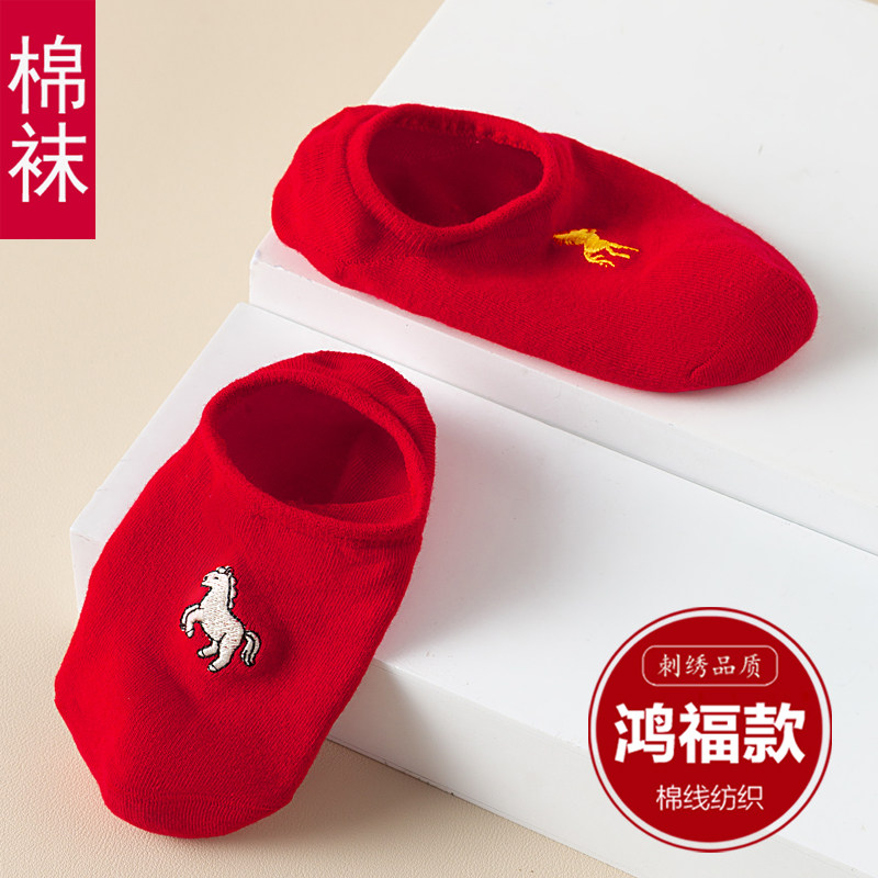 本命年袜子红色短袜船袜浅口袜男女薄款 情侣袜一对大红属马年礼物