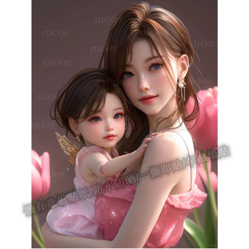 治愈系母女亲子海报贴画墙上门窗装 饰贴纸美少女遮丑防水贴纸自粘