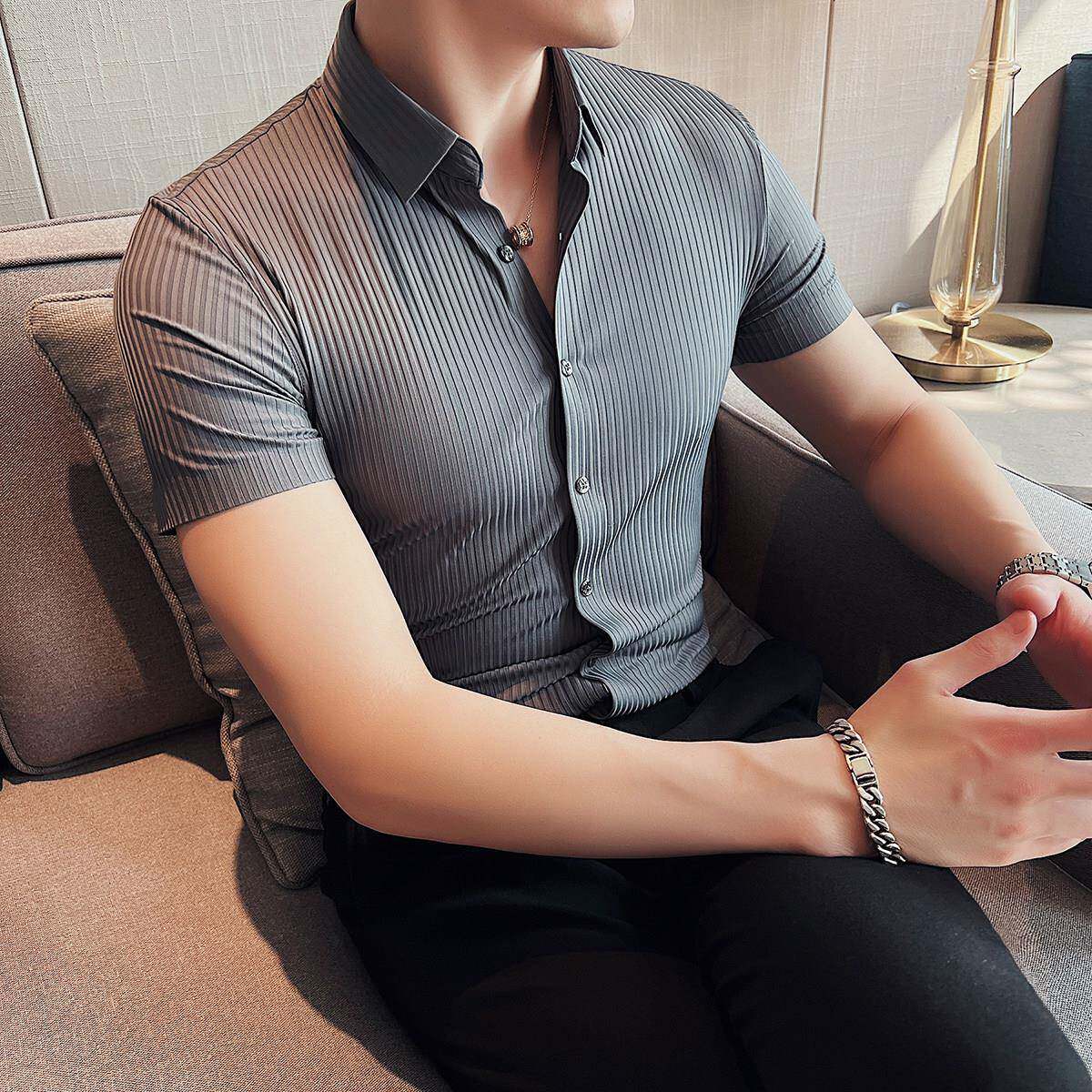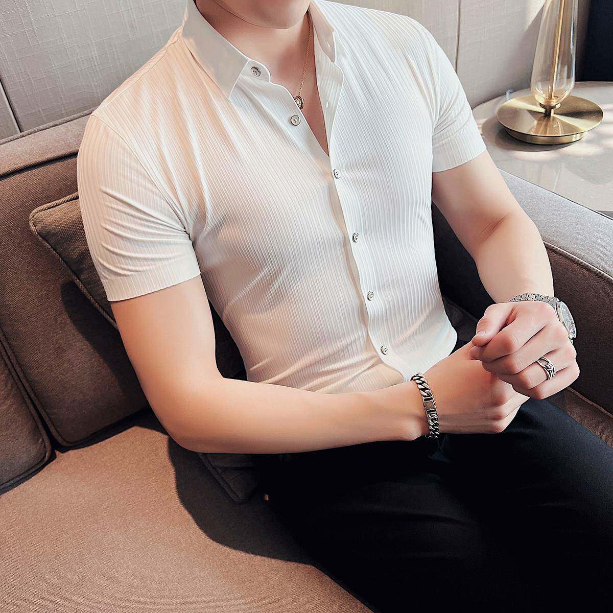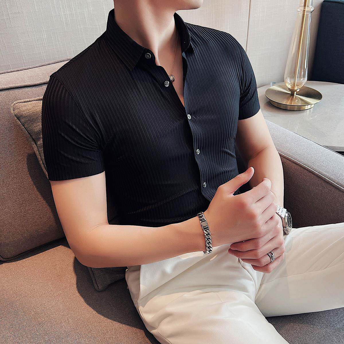衬衫 男夏季 薄款 高弹冰丝无痕短袖 商务休闲高级感修身 痞帅条0130r
