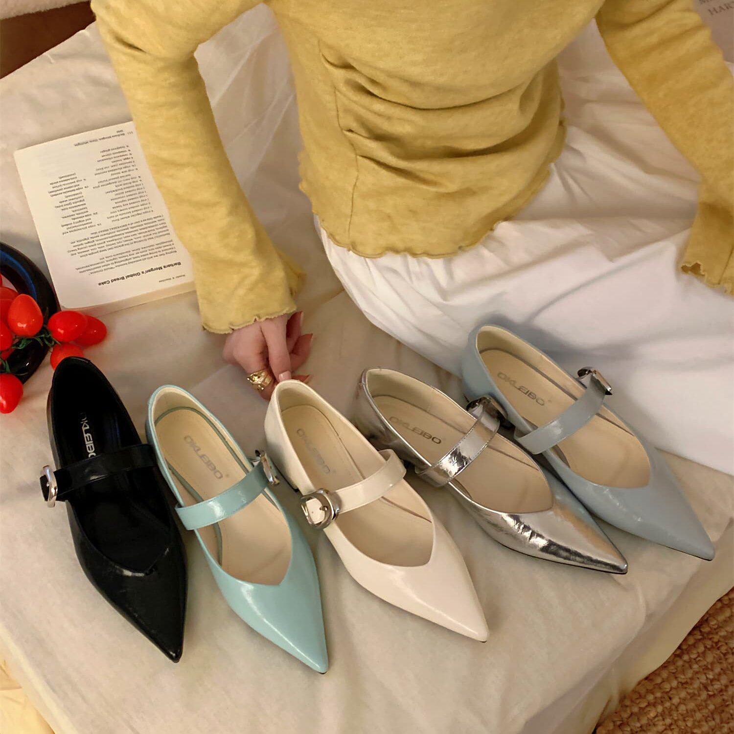 一字扣带浅口单鞋 子 真皮鞋 百搭复古风尖头玛丽珍鞋 女温柔舒适春季