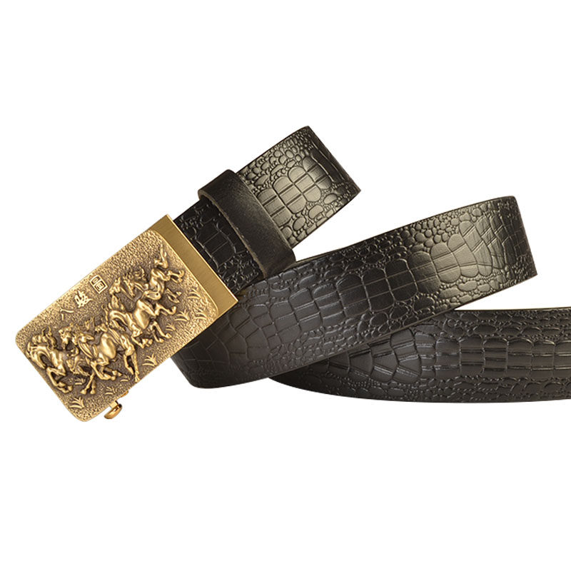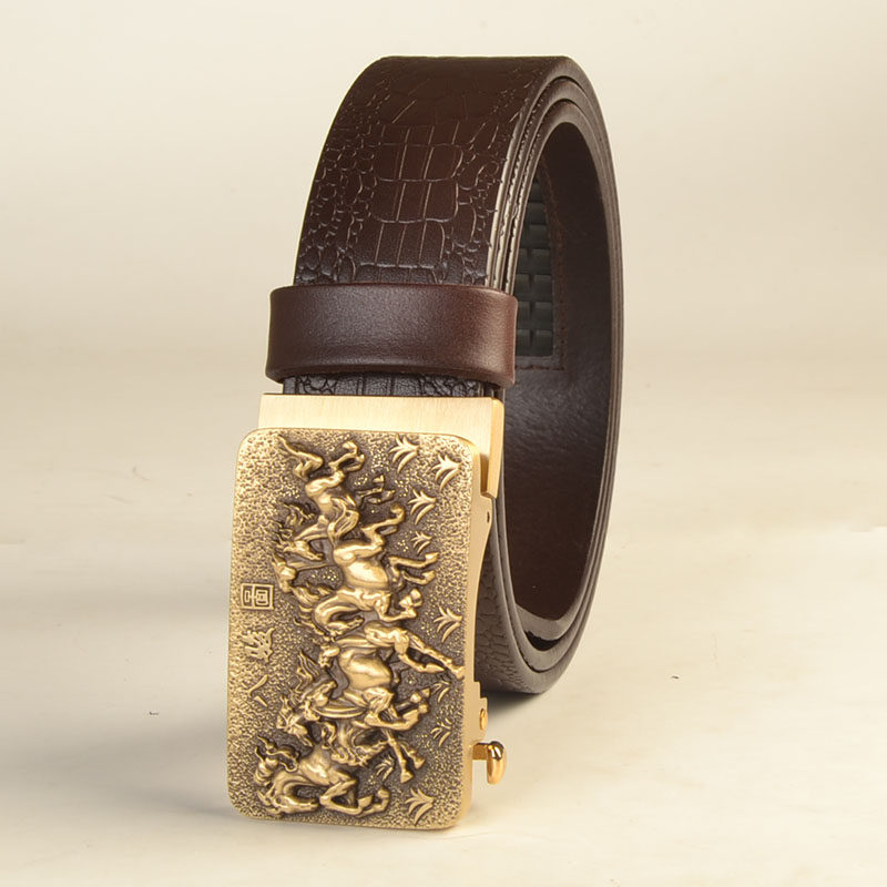 本命年生肖马自动扣皮带男头层牛皮裤 腰带八骏图真皮商务卡槽腰带