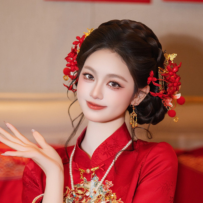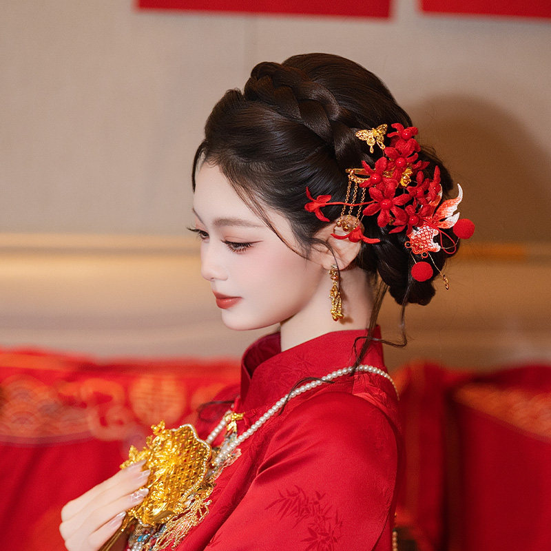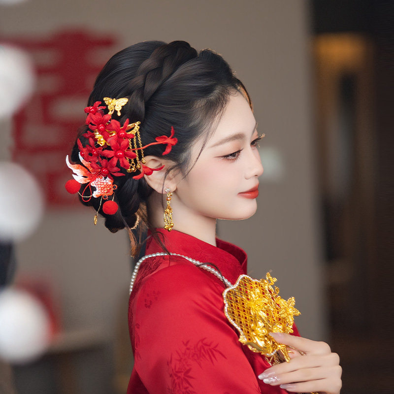 复古新娘发饰新中式 红色仿真花小财神锦鲤发钗订婚新年敬酒服发饰