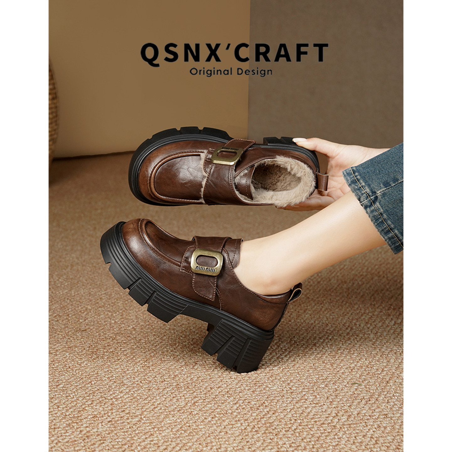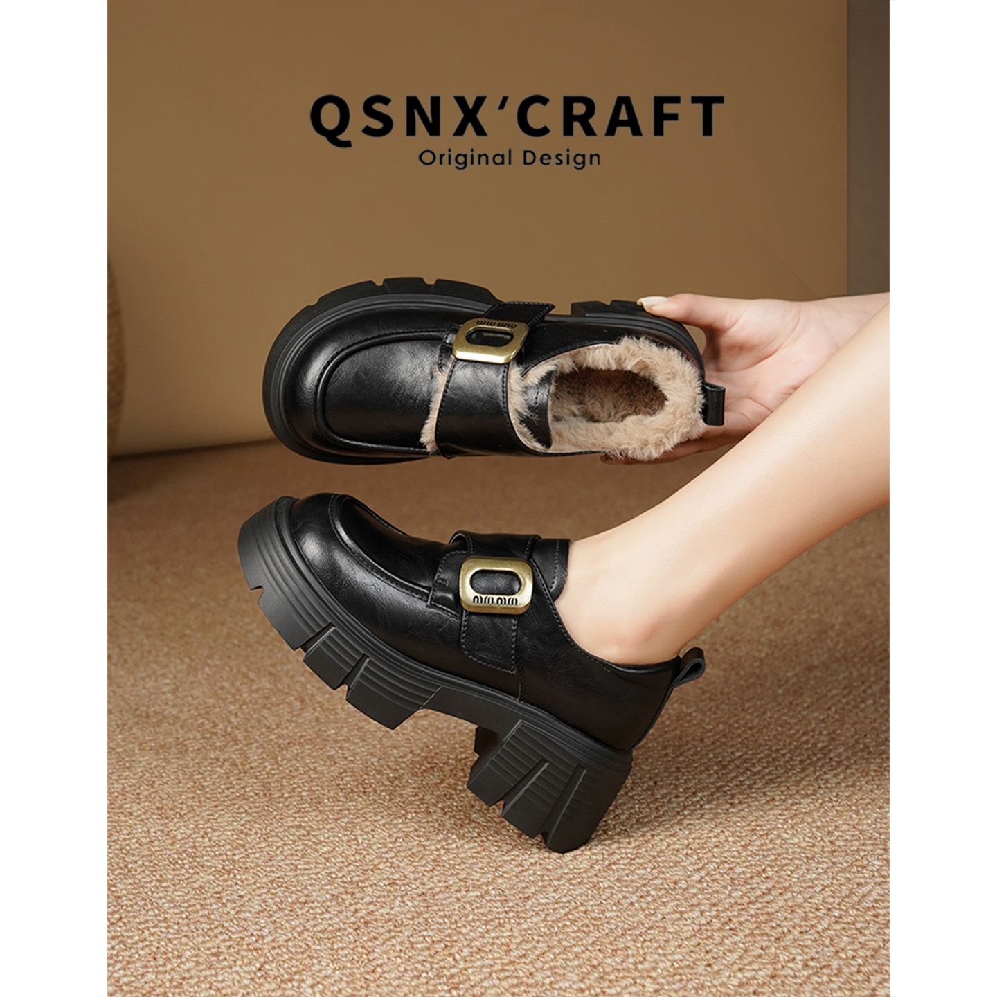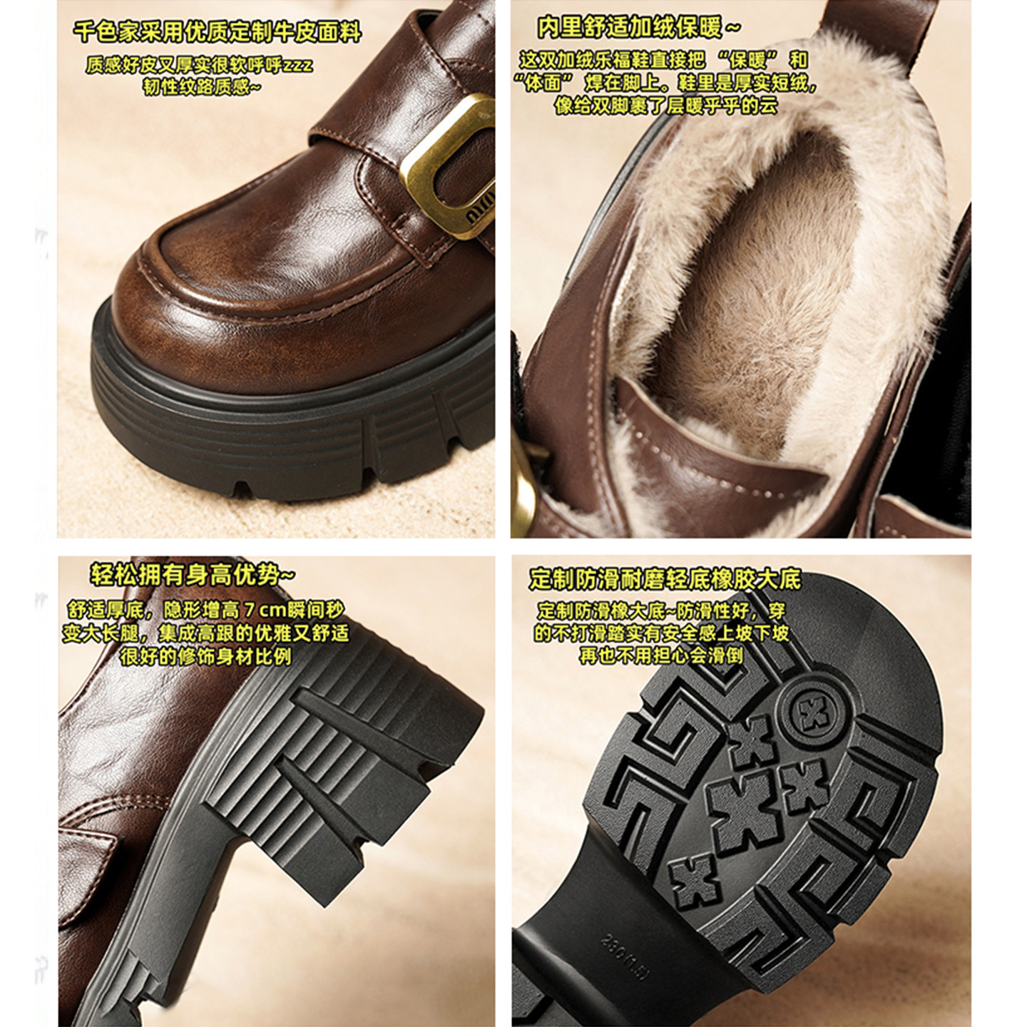 秋冬加绒乐福鞋 女2025新款 棕色增高单鞋 牛皮版 厚底英伦风小皮鞋