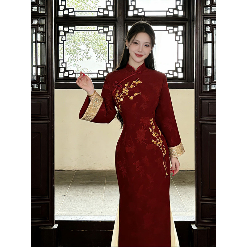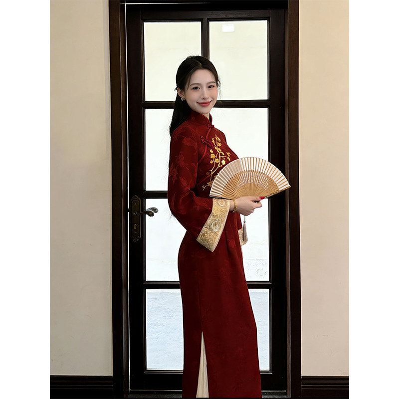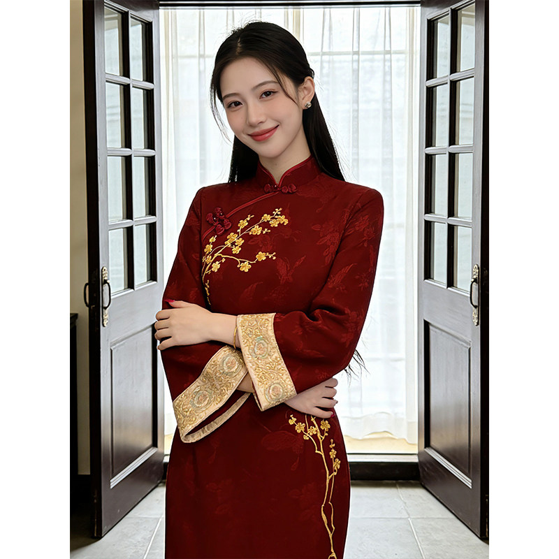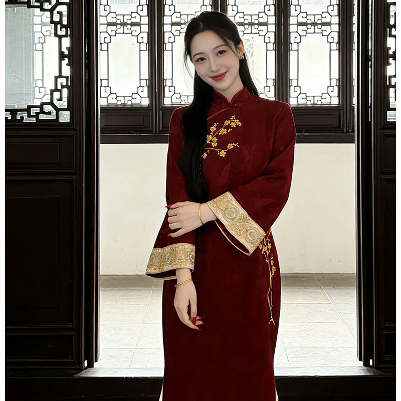 刺绣订婚礼服国风改良连衣裙金梅报喜倒大袖 新中式 红色旗袍女冬装