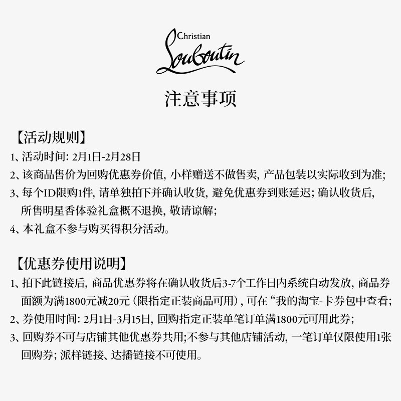 CL路铂廷香氛体验装 VIP专享 晚香琥珀香水2ml1支 商品标签: VIP专享 发布时间:2026年02月07日 市 场 价:20 元 折 扣 价:20 元 所 在 地:浙江 嘉兴 店铺掌柜:Christian Louboutin路铂廷美妆旗舰店 去购买>> 下架了的话点我重新搜索 本站来源:淘宝(www.xiuda.net)购物与天猫(www.tianmaocn.com)是一个知名的电商平台,淘宝同时您也可以访问(www.taobao.lc)来发现更多精彩的购物选择天猫(www.tmall.lc)。