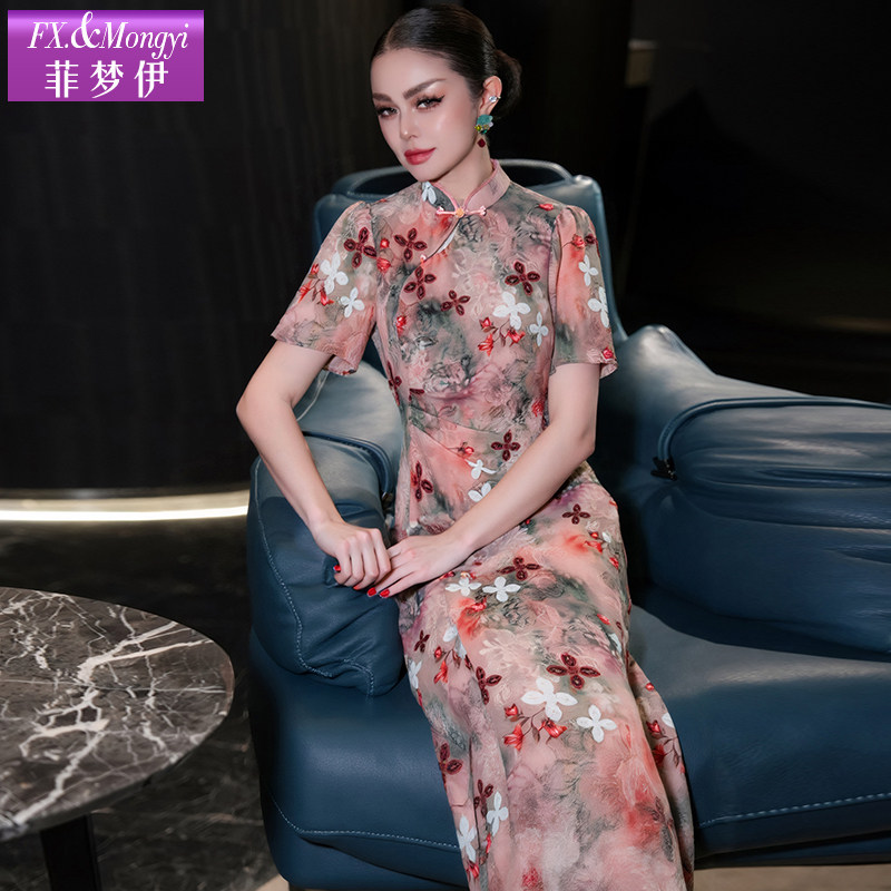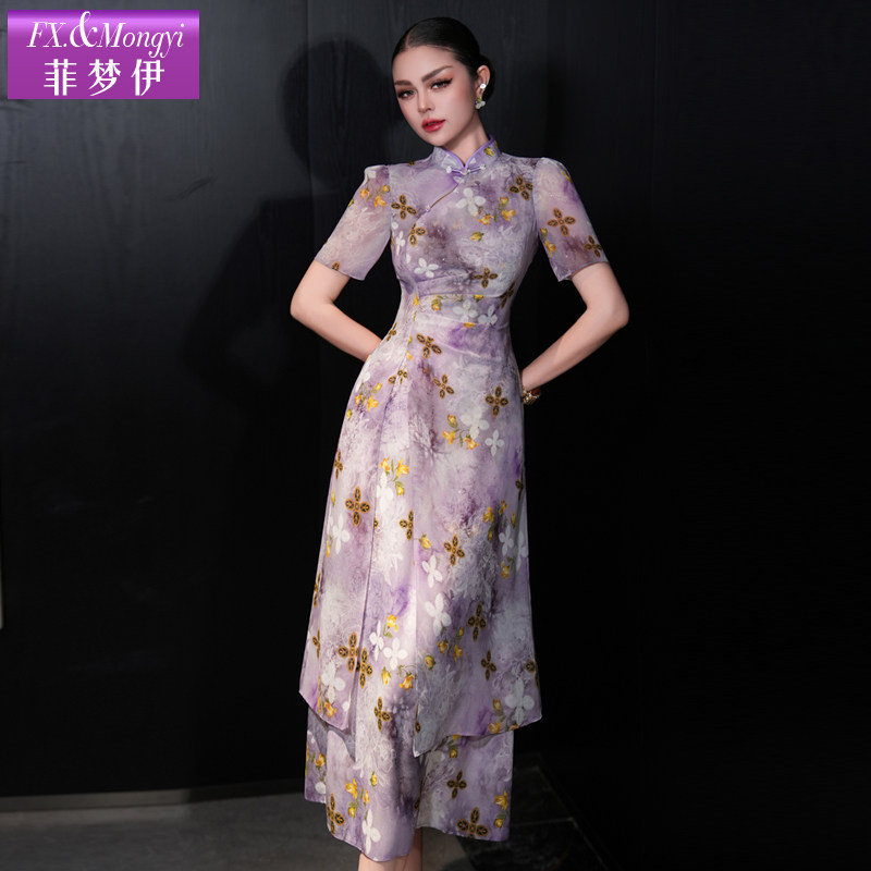 国风立领修身 菲梦伊紫色印花新中式 连衣裙女夏装 褶皱改良旗袍裙子