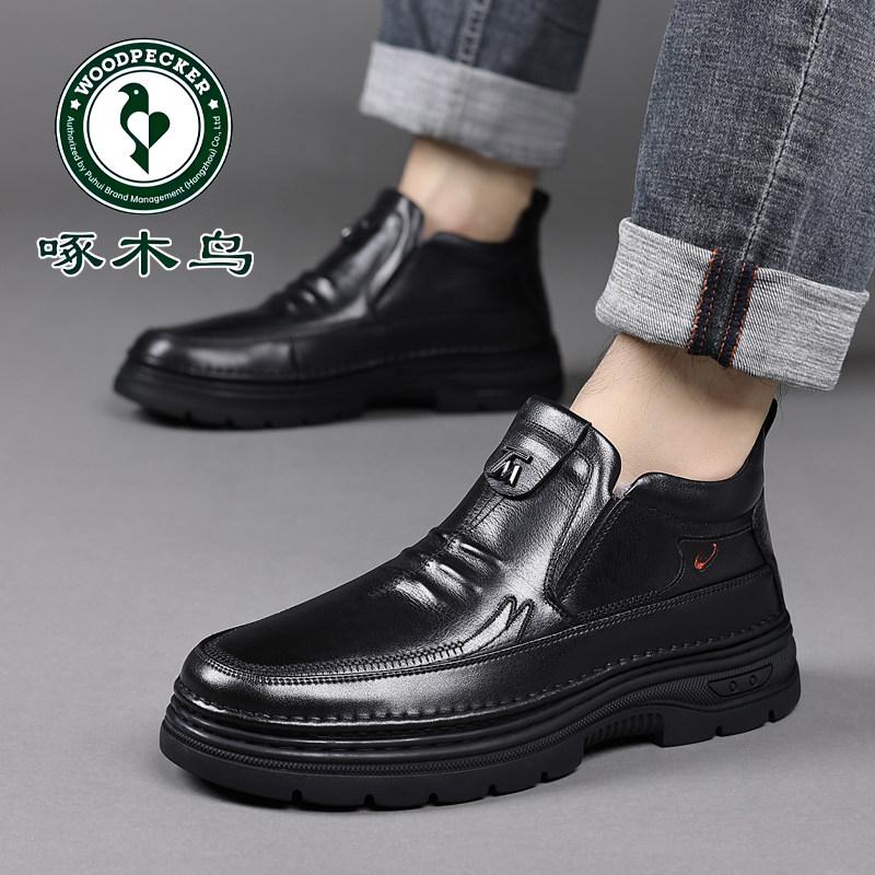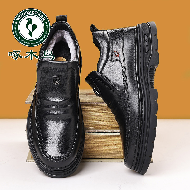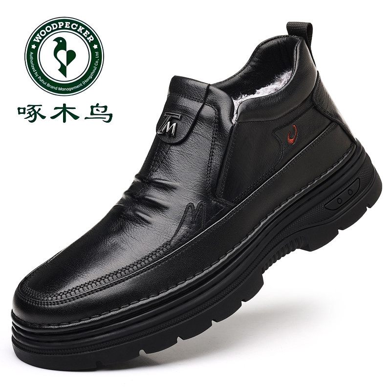 厚底防滑中老年爸爸鞋 啄木鸟男鞋 雪地靴 男士 皮鞋 冬季 加绒保暖棉鞋