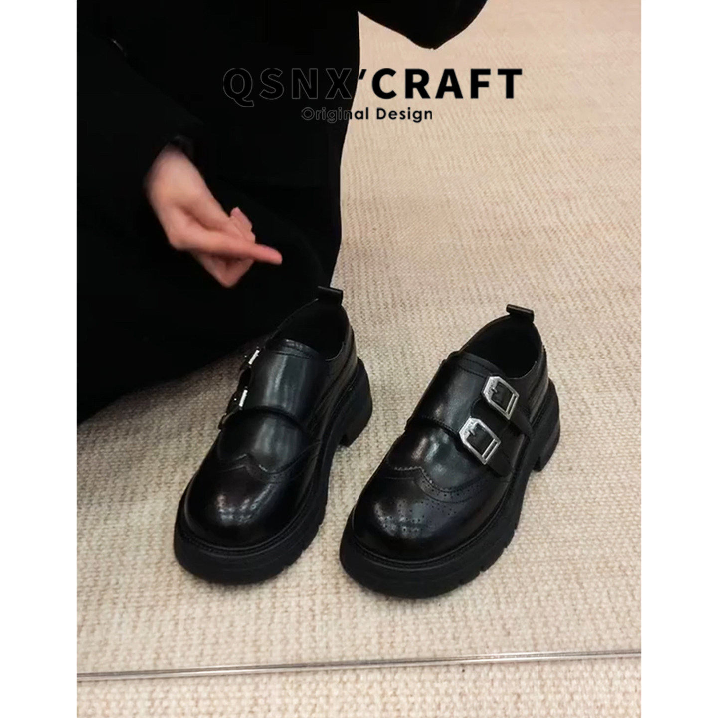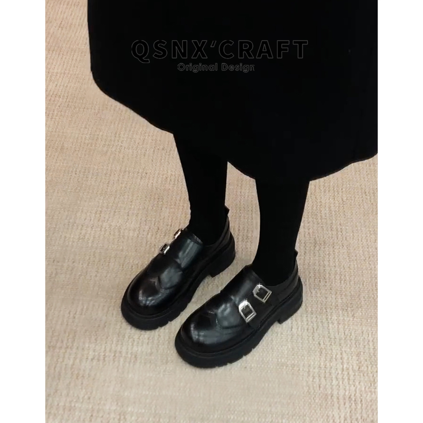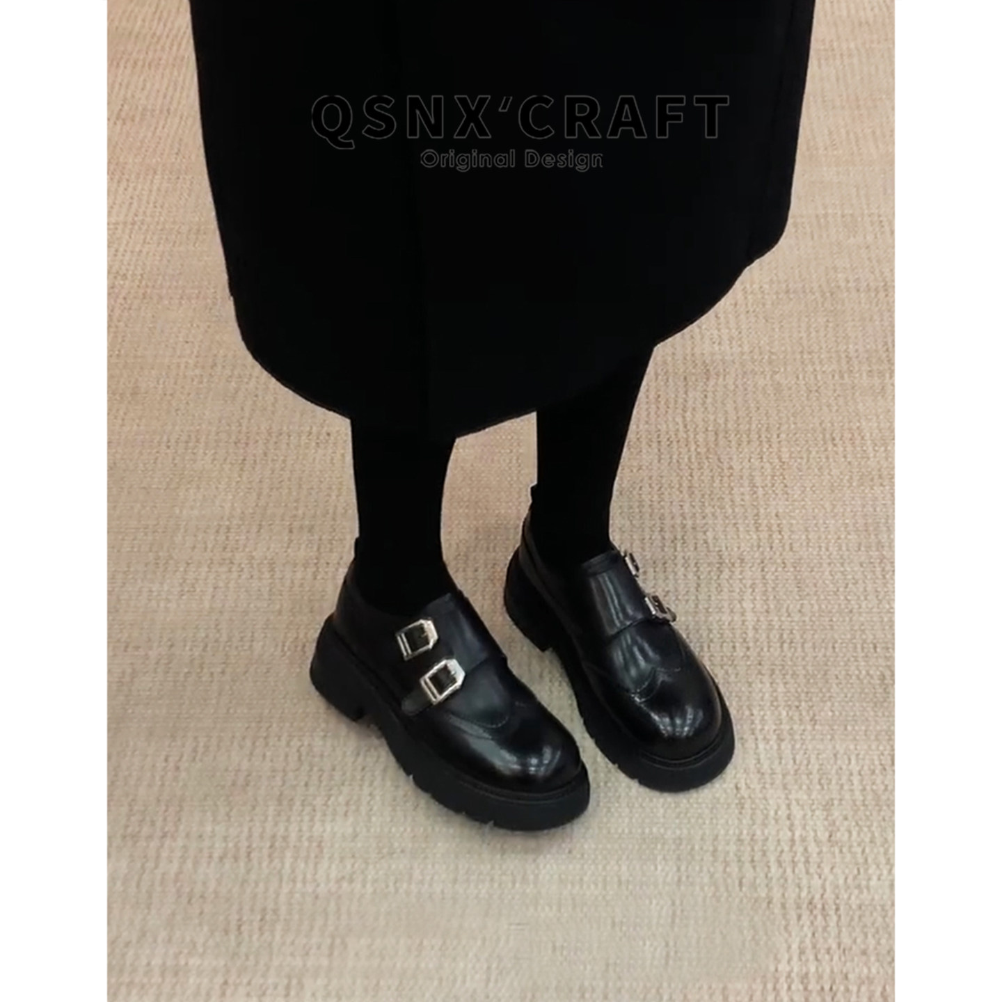 牛皮版 黑色皮带扣厚底粗跟小皮鞋 英伦风布洛克乐福鞋 女2025新款