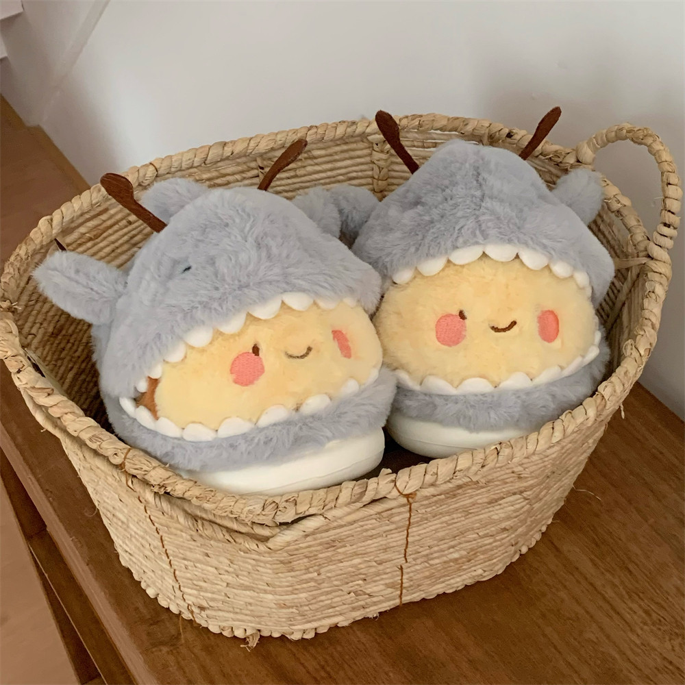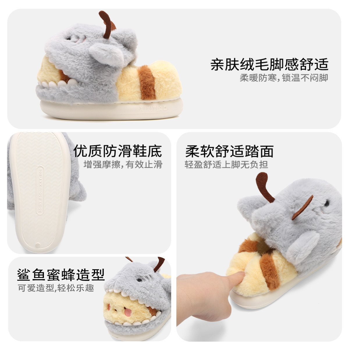 细细条 趣味情侣包跟毛毛拖冬防滑男女棉拖鞋 鲨bee居家鞋 网红时尚