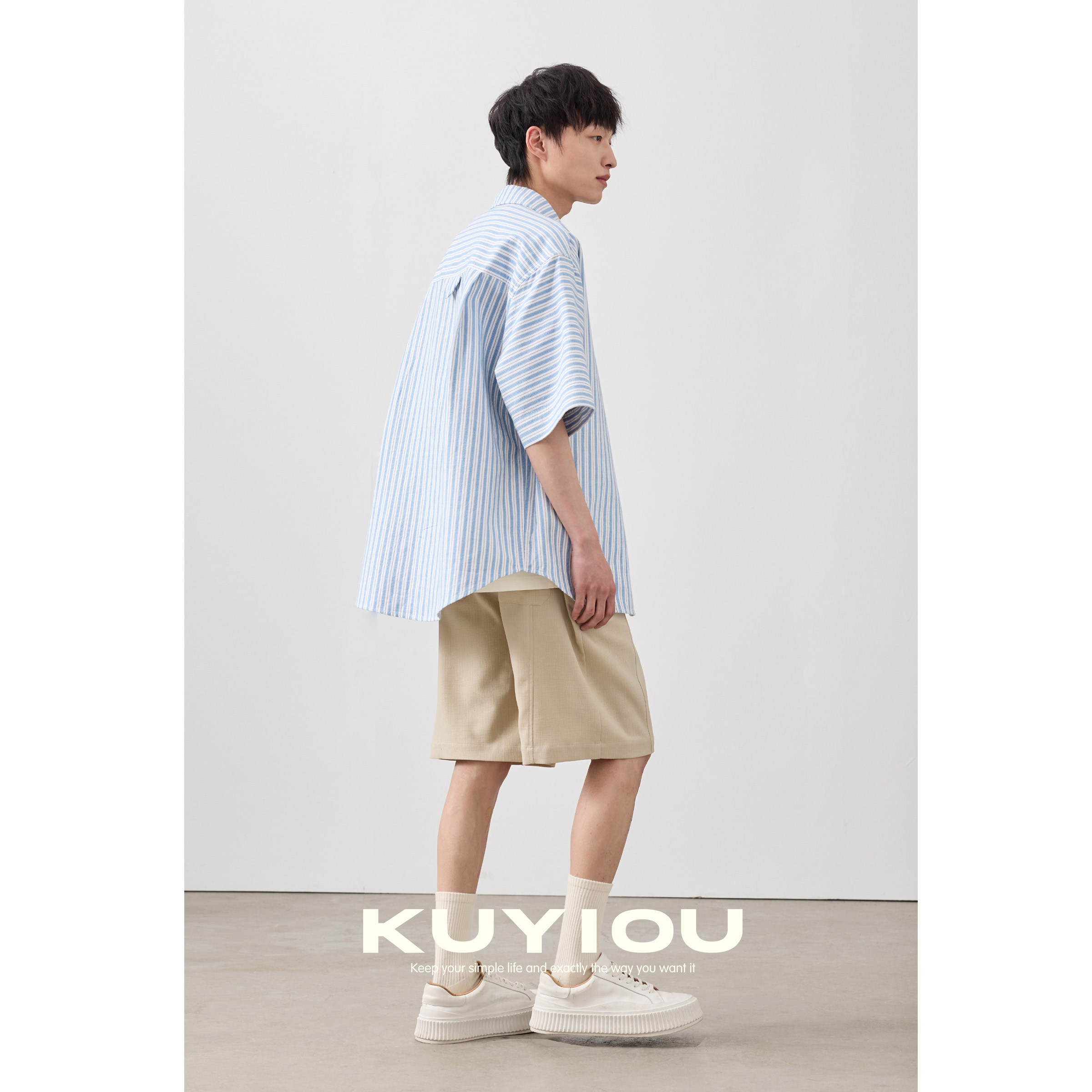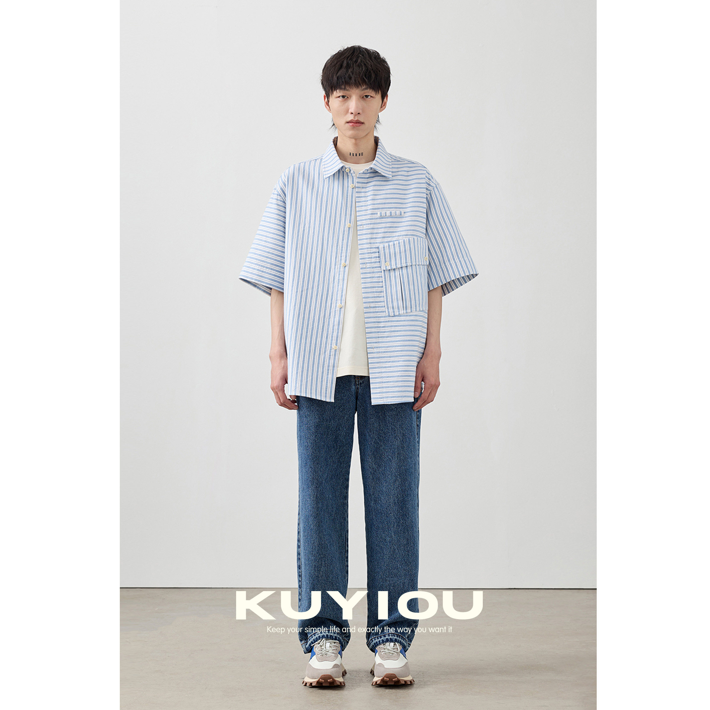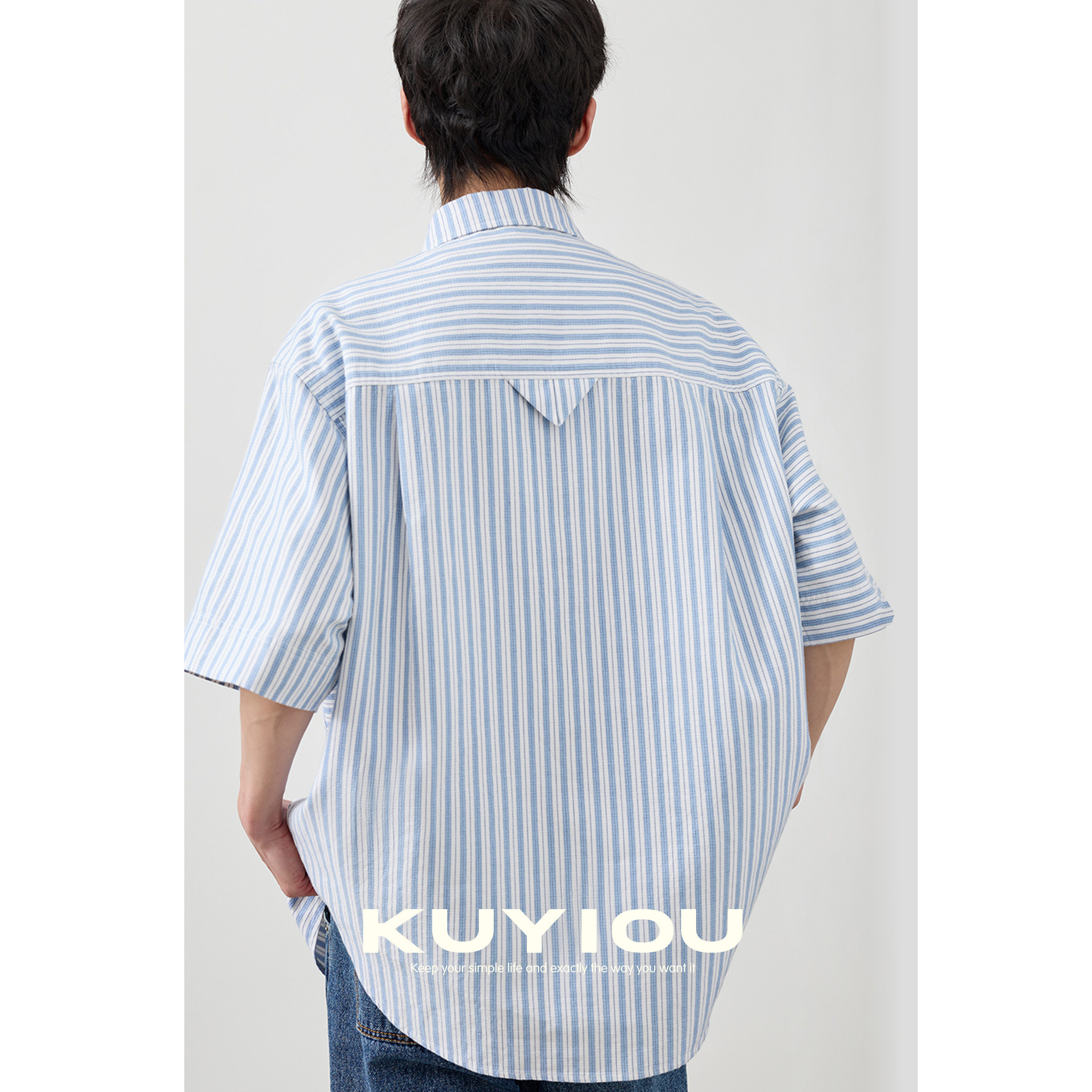 KUYIOU 男 衬衫 慵懒浅蓝白条纹 双层棉色织大口袋宽松廓形五分短袖