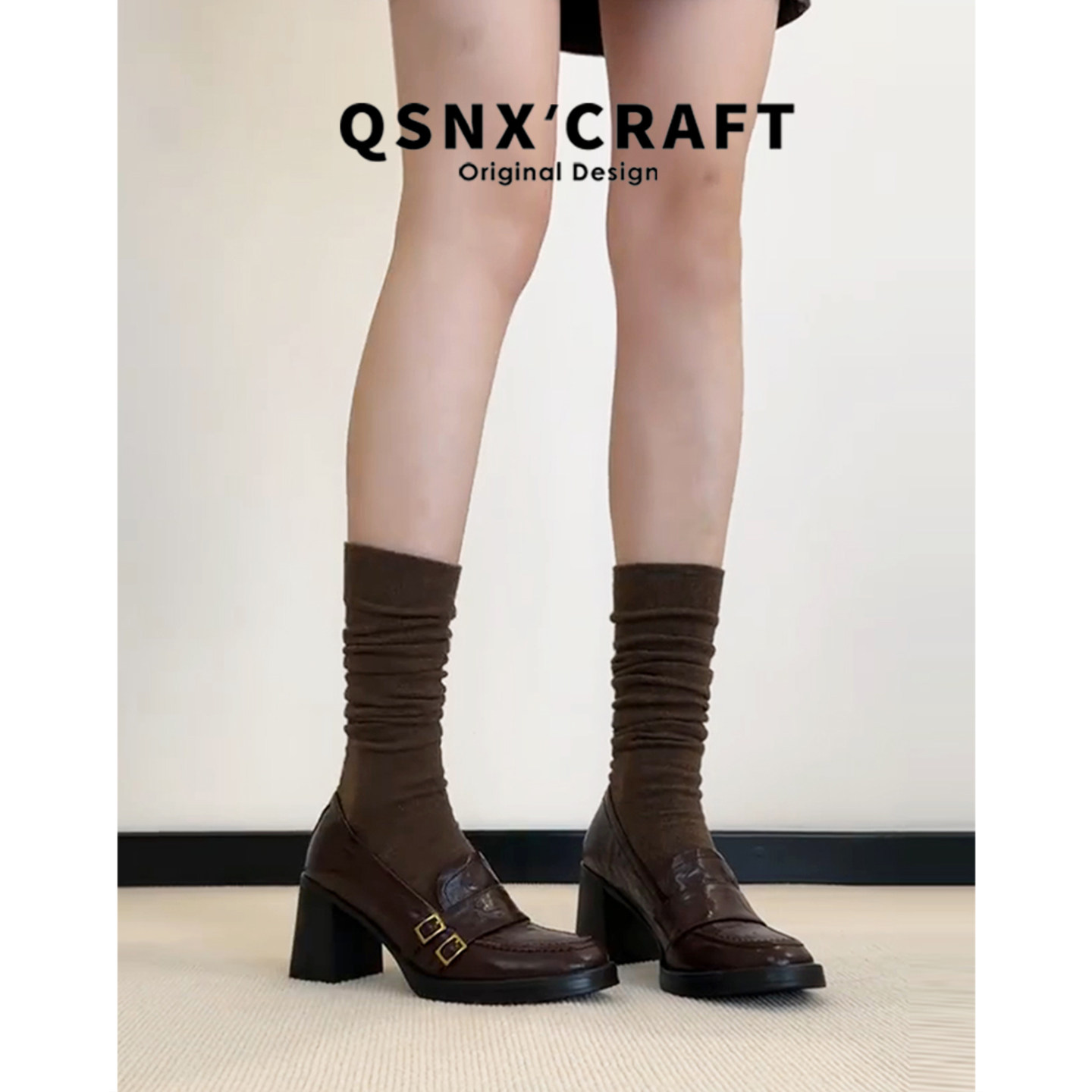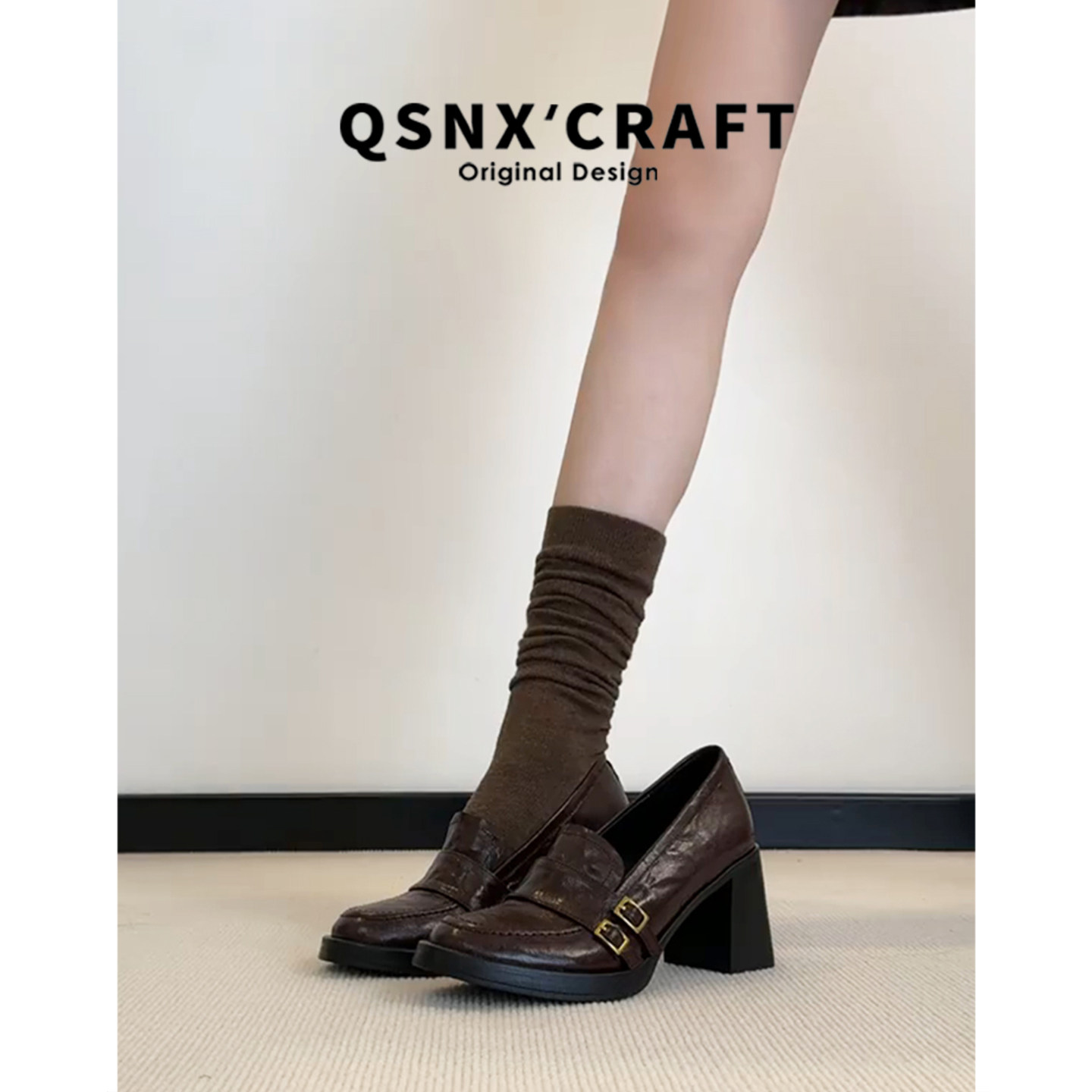 加绒搭扣乐福鞋 女2025秋冬新款 高跟单鞋 牛皮版 增高英伦风小皮鞋