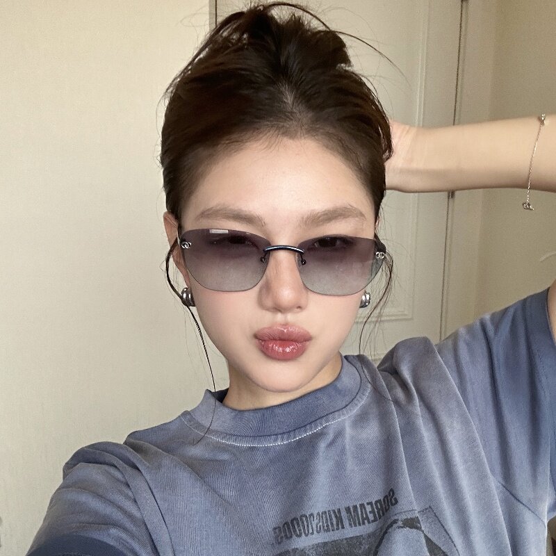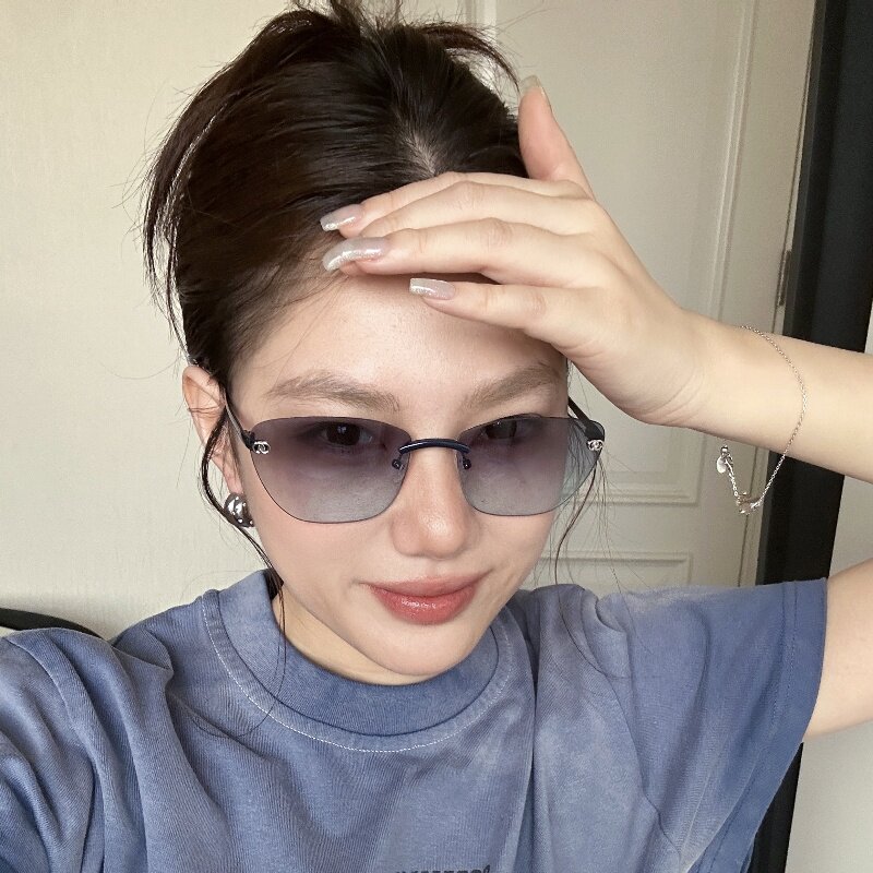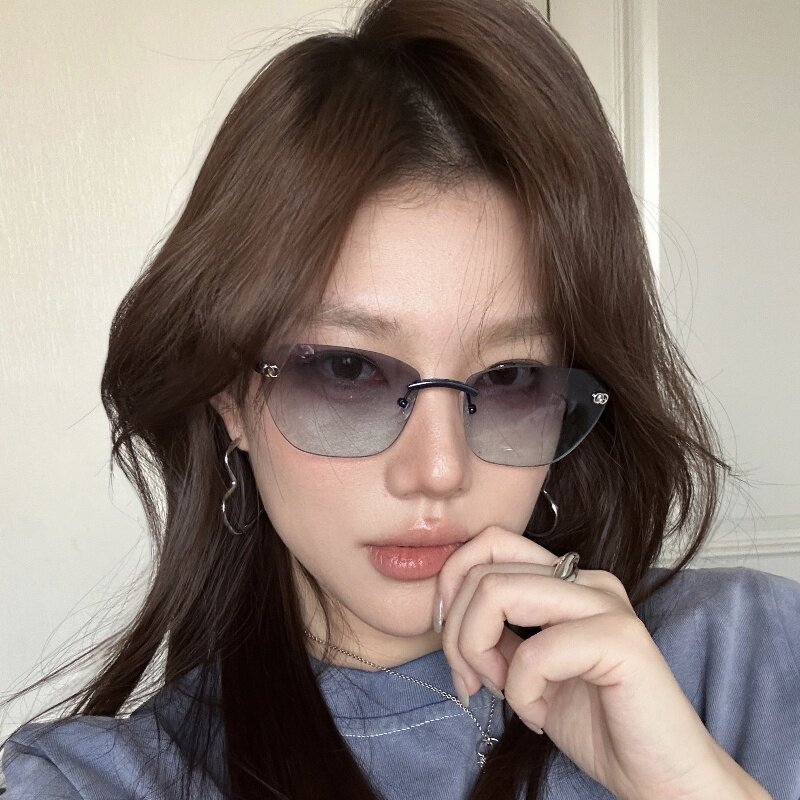 复古欧美辣妹风无边框猫眼渐变蓝墨镜女方圆脸显瘦高级网感太阳镜