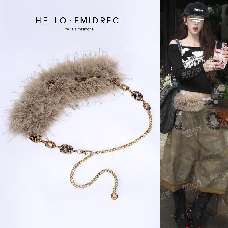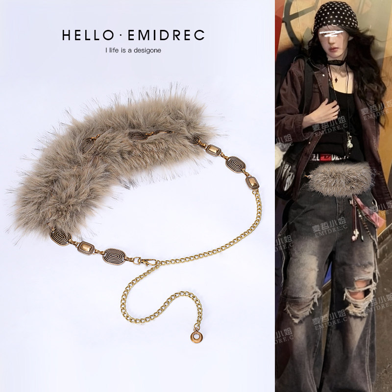 复古朋克嘻哈爵士舞腰带配饰女腰链腰部装 饰毛绒毛毛腰饰配牛仔裤