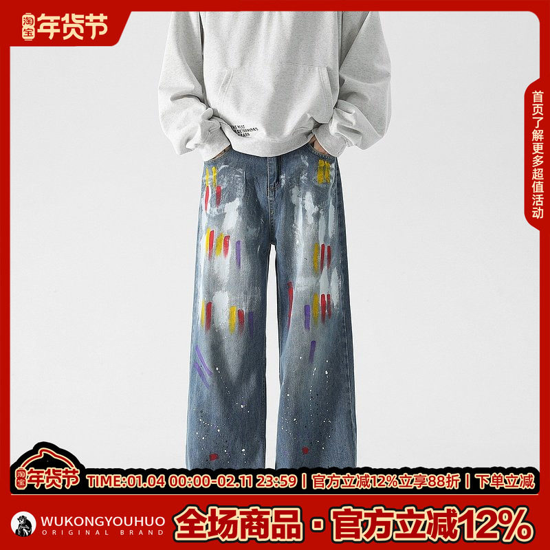 悟空有货潮牌设计感泼墨涂鸦宽松直筒牛仔裤 男嘻哈街头休闲阔腿裤