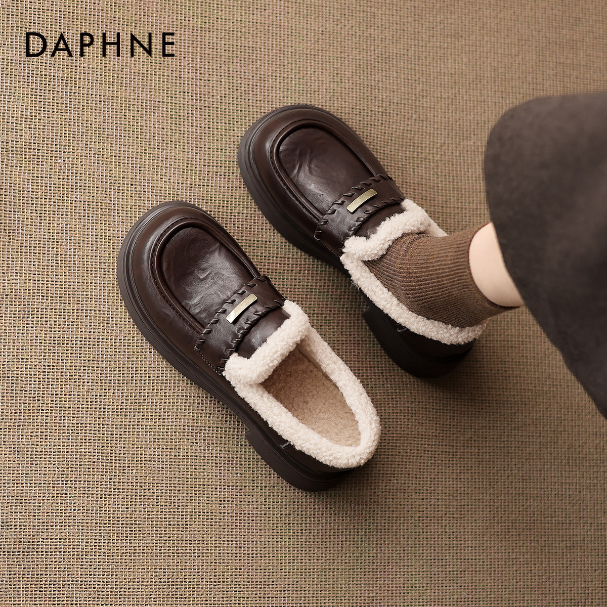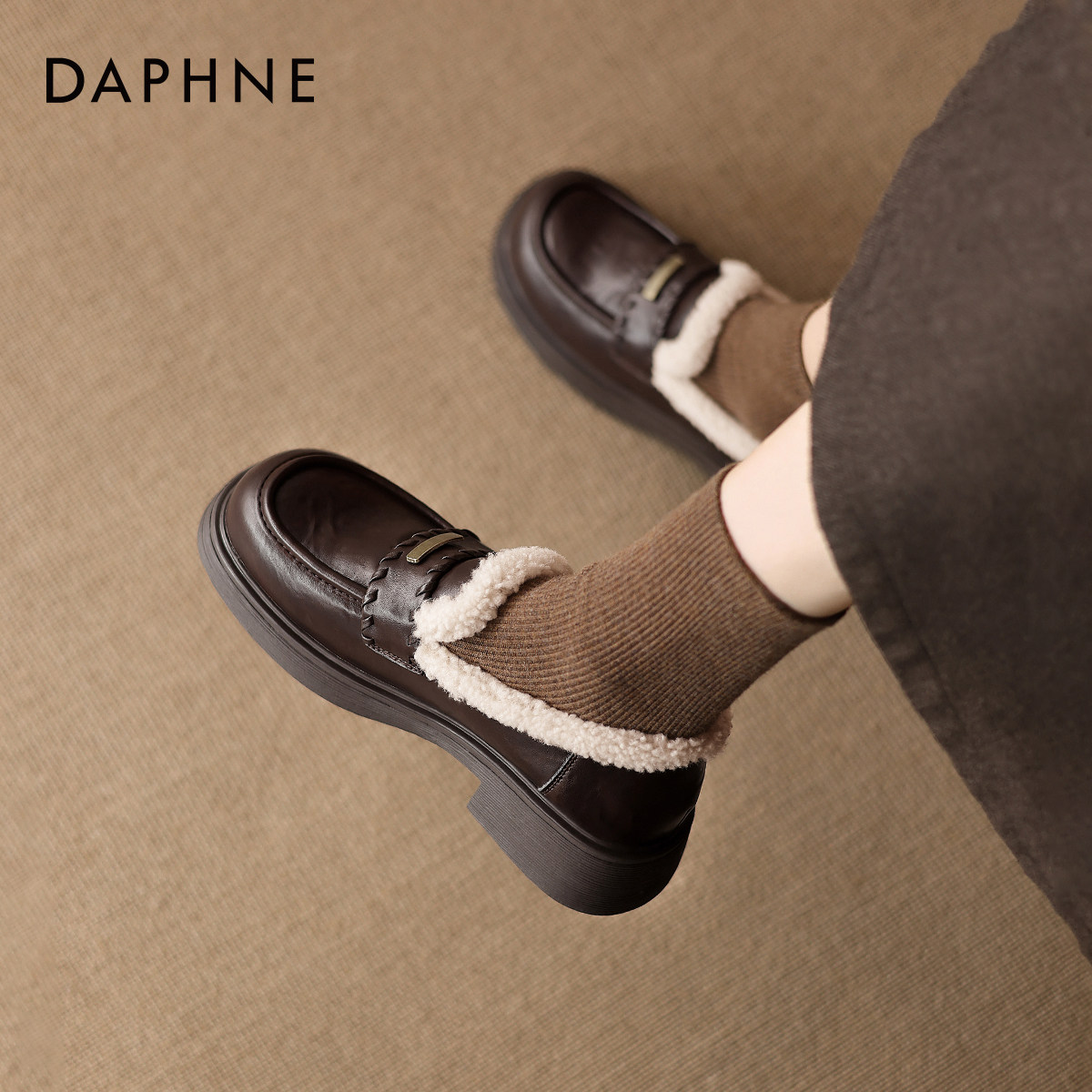 女款 法式 2026新款 达芙妮加绒乐福鞋 冬季 棕色厚底单鞋 英伦风小皮鞋