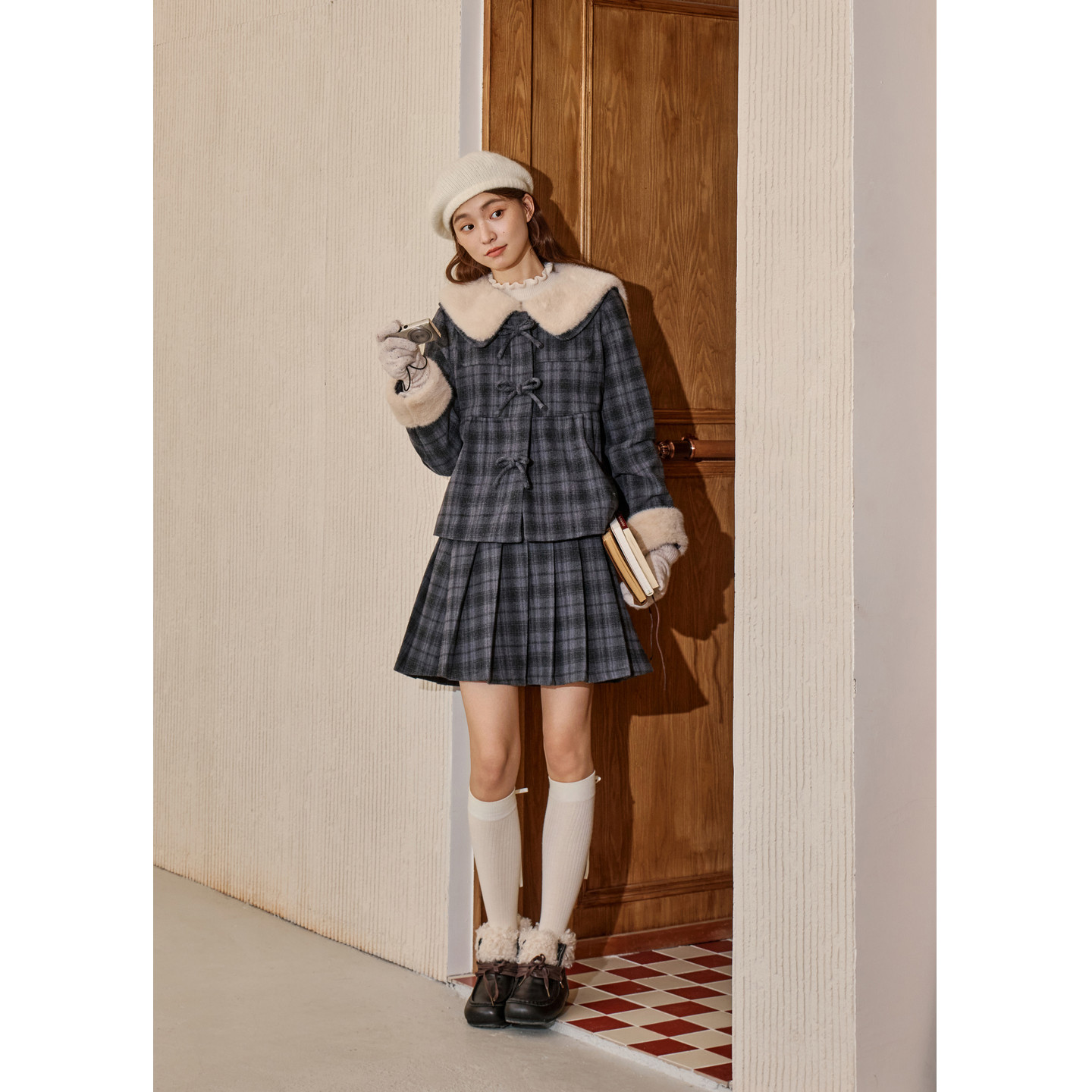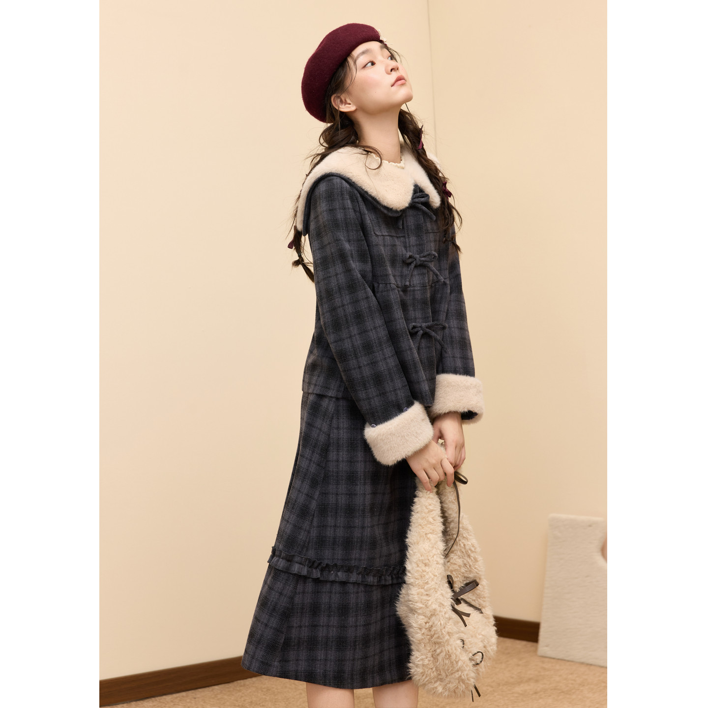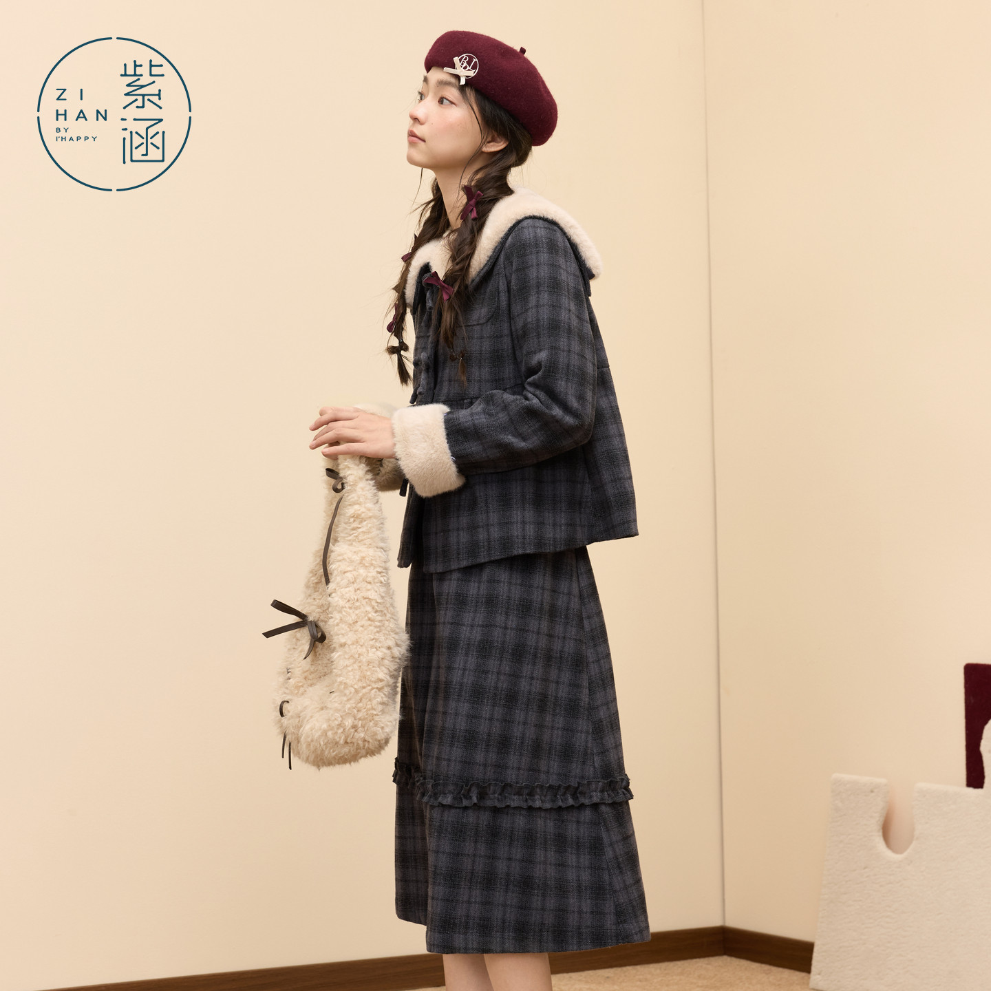 好物体验专享 紫涵毛呢蓝灰格纹外套a字半身裙两件套2025冬新