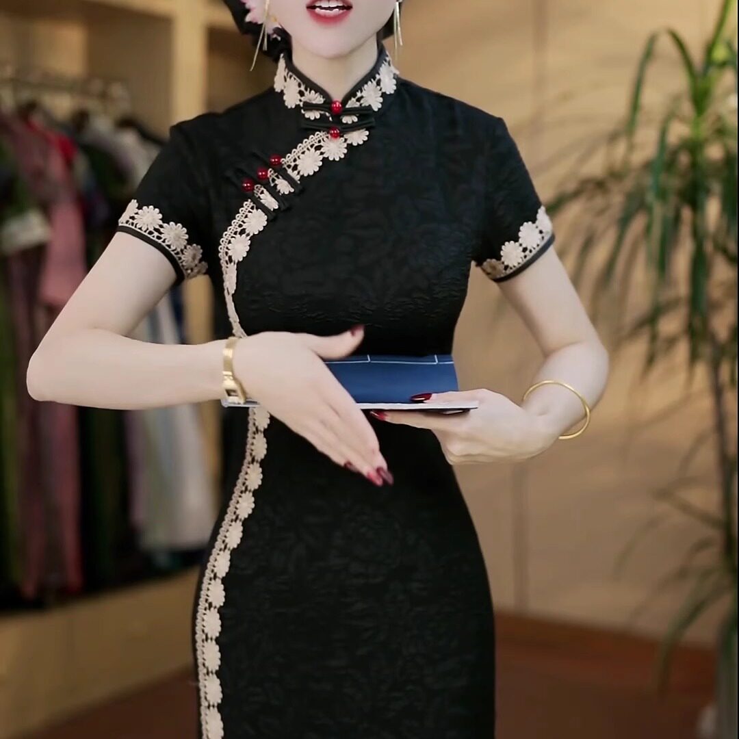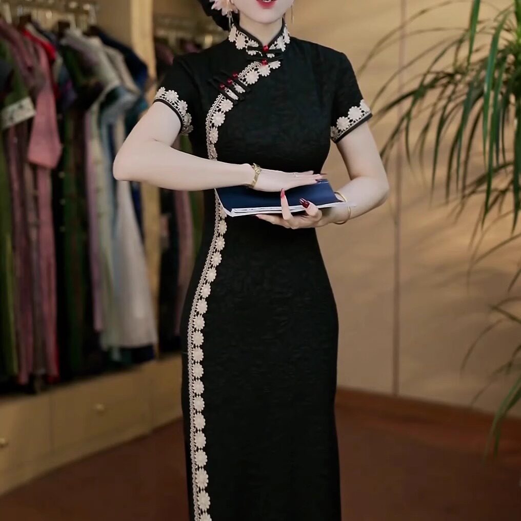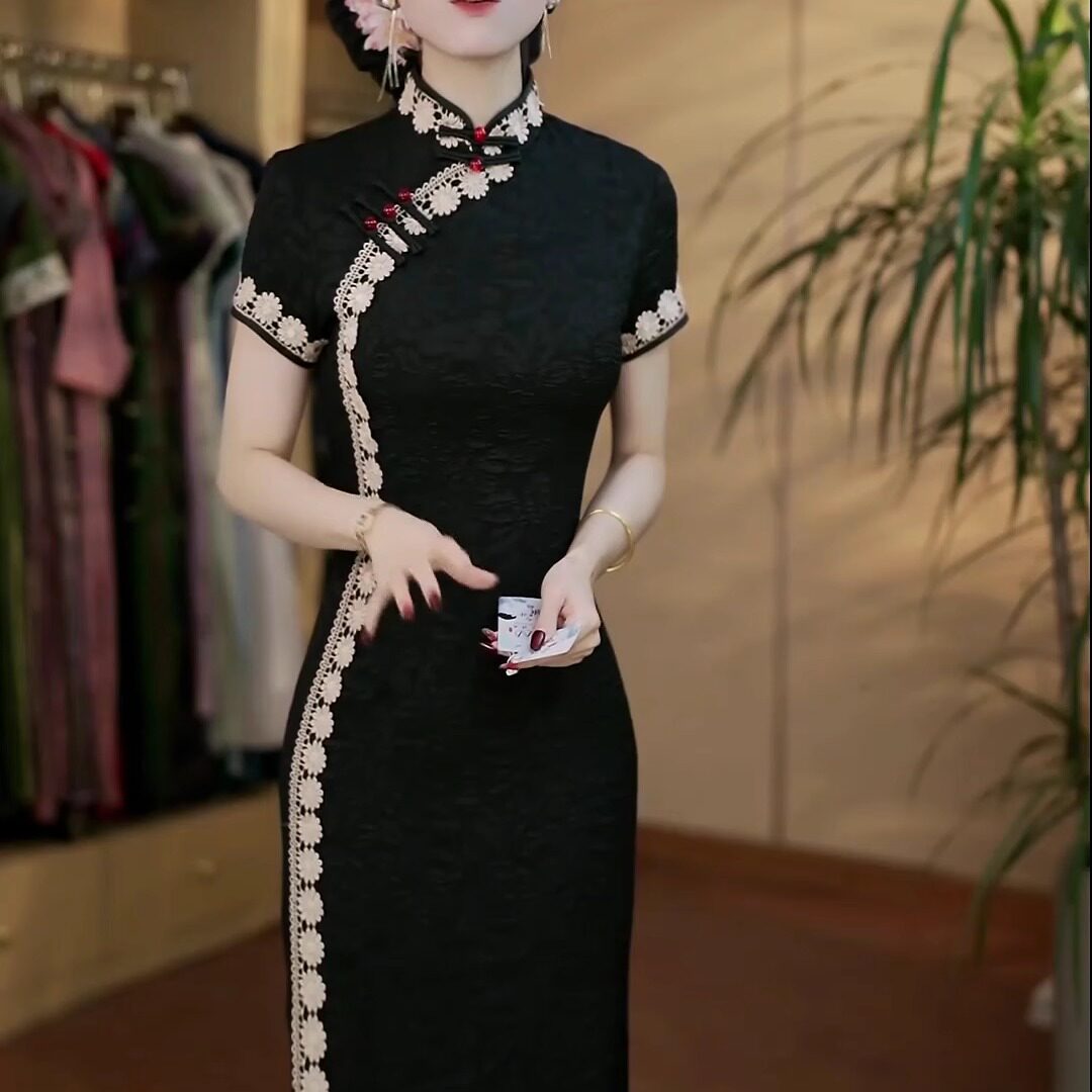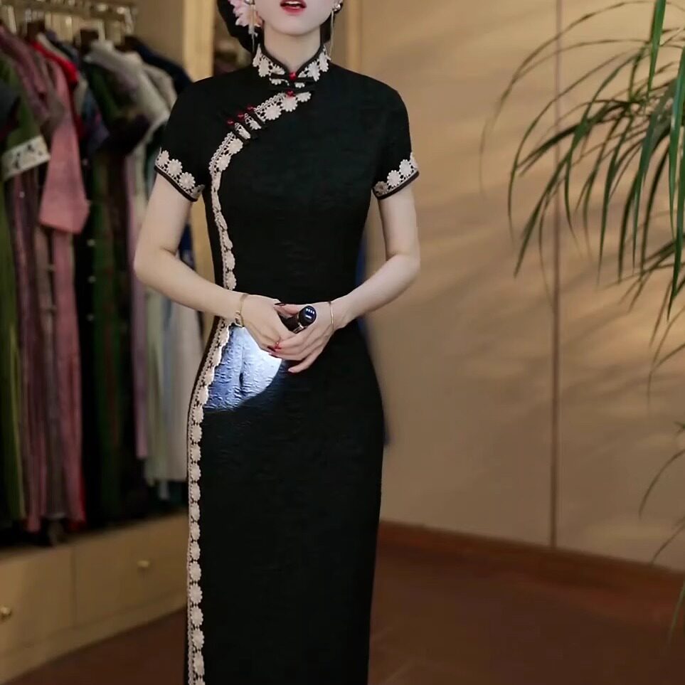 高端时尚 复古重工提花蕾丝刺绣改良旗袍长裙女气质收腰显瘦连衣裙