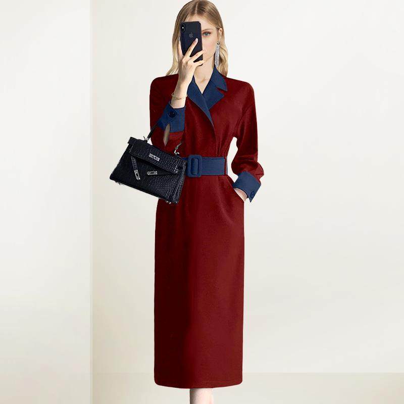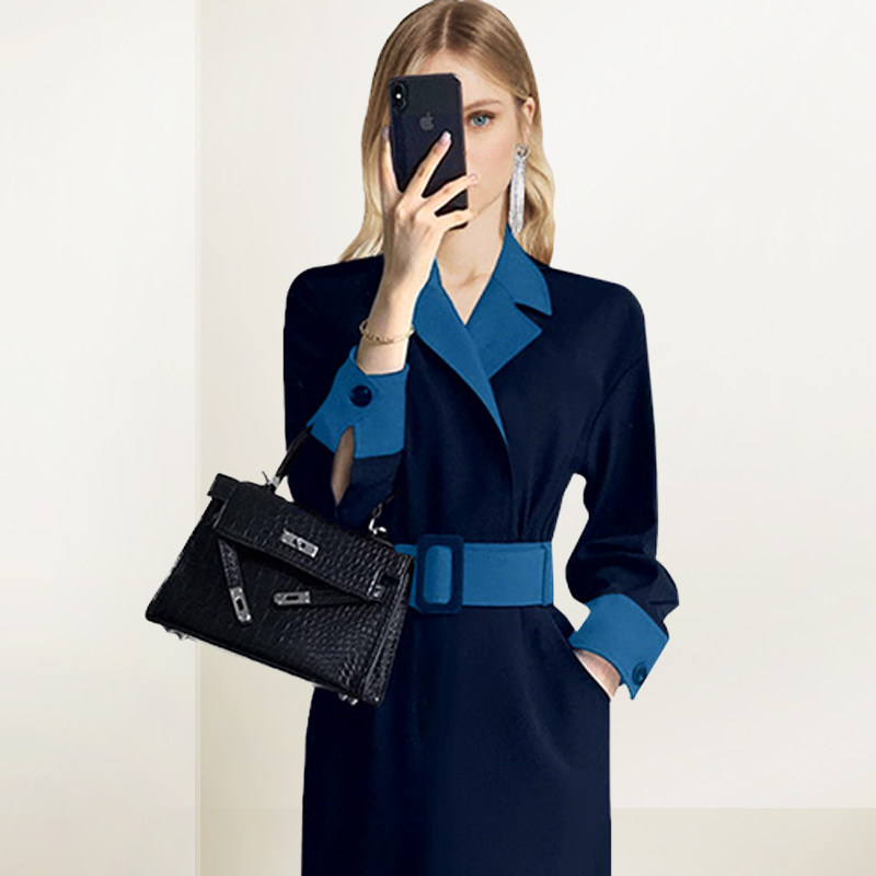 气质拼接蓝色收腰连衣裙女2026年春季 新款 假两件通勤减龄收腰裙子