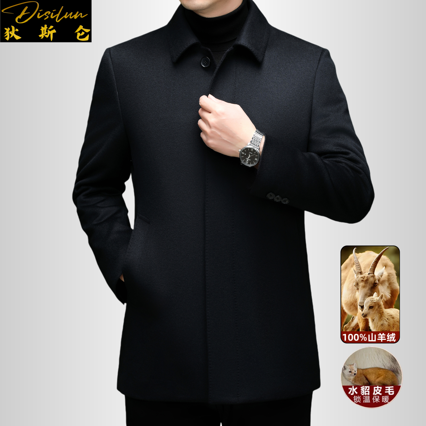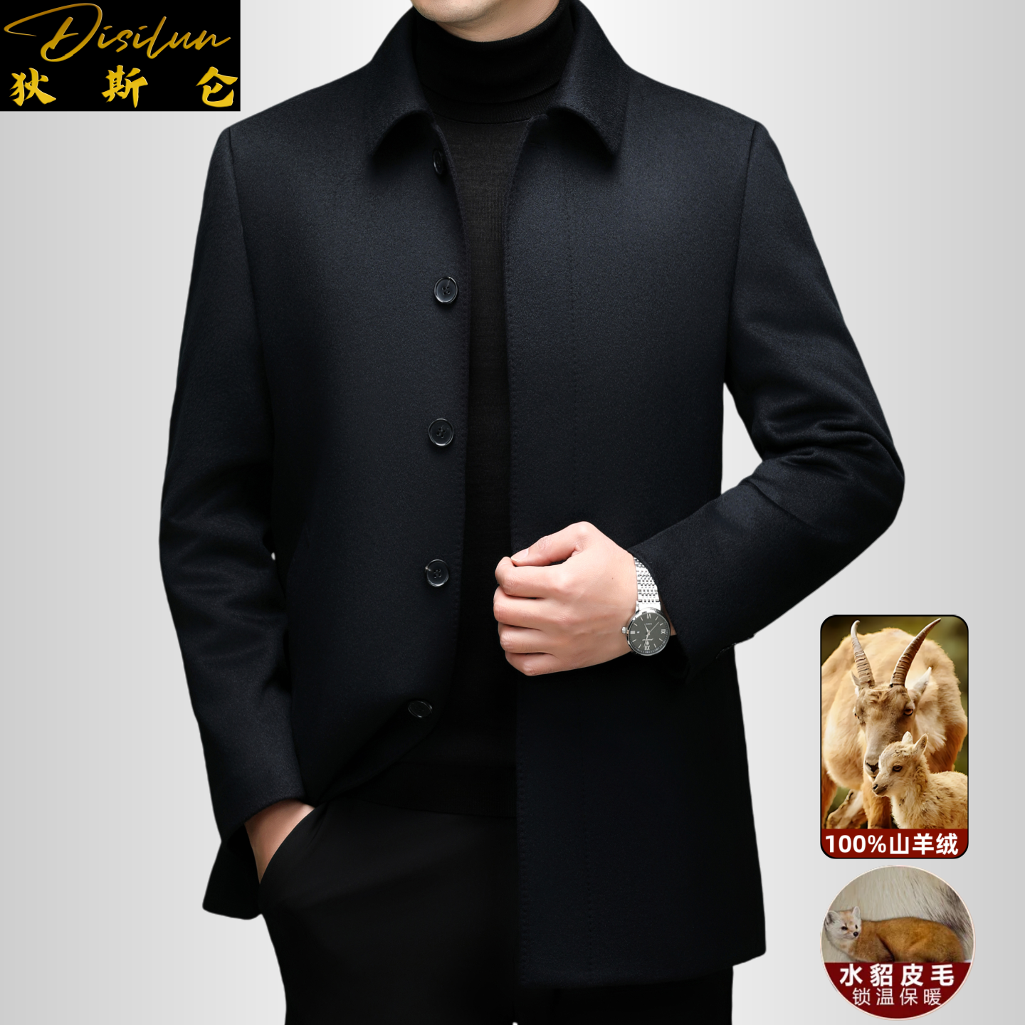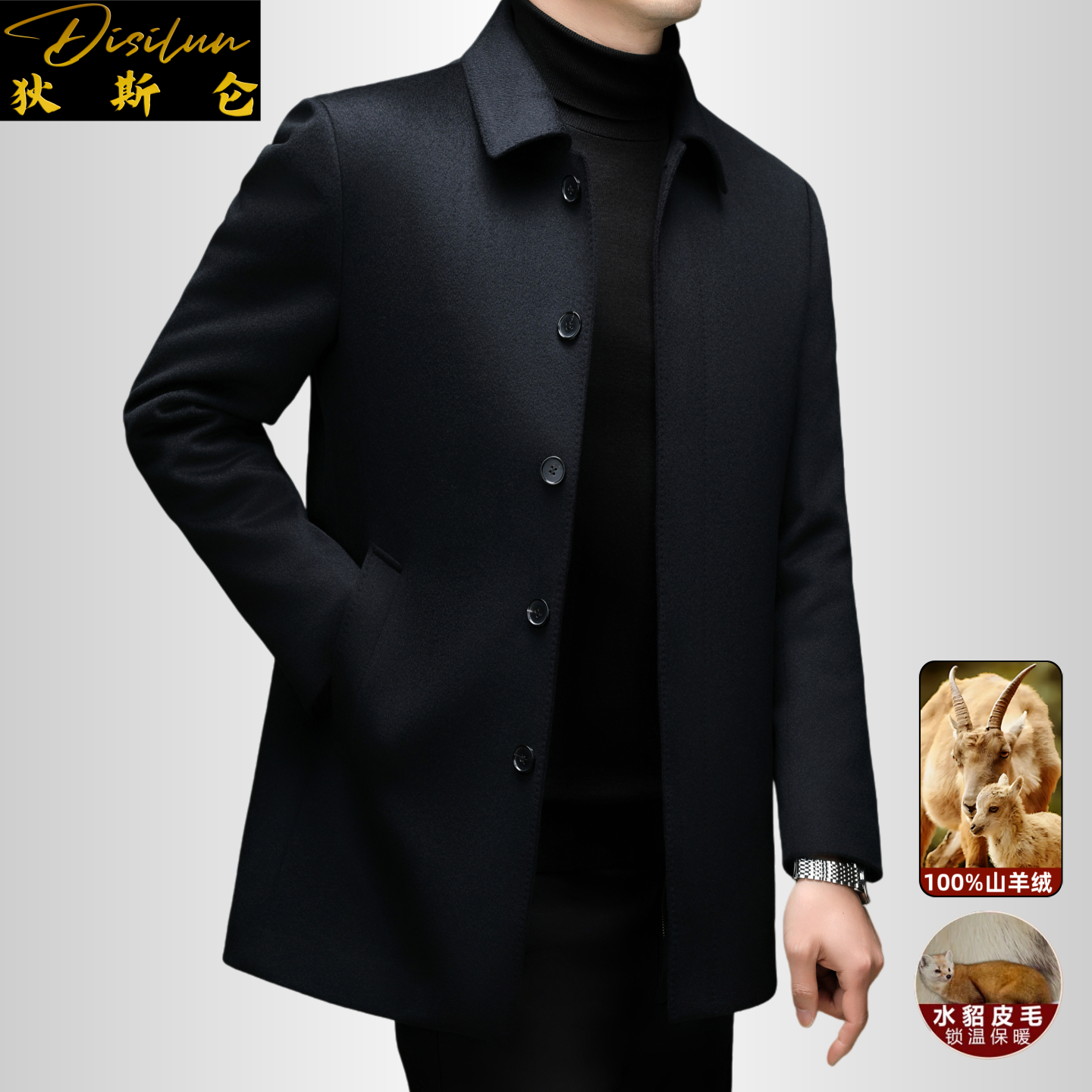 新款 狄斯仑高端山羊绒大衣男士 冬季 可脱卸水貂内胆商务毛呢厚外套